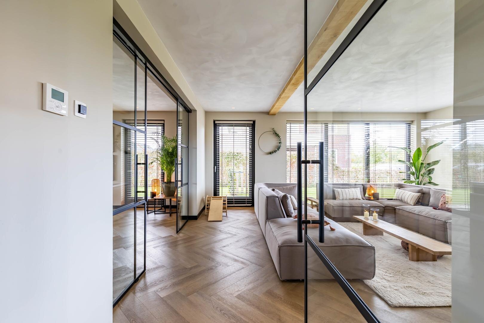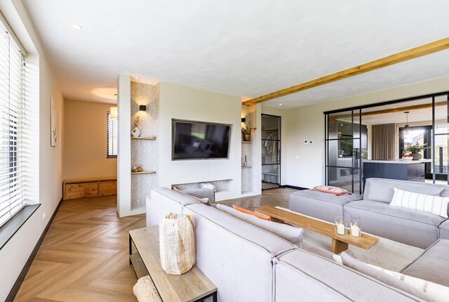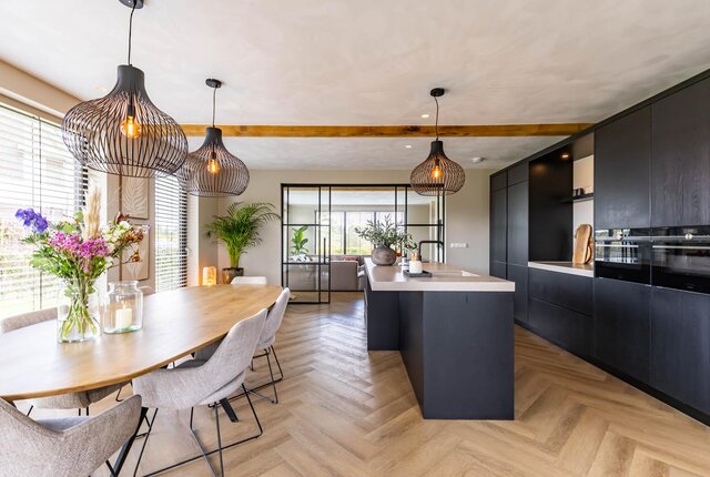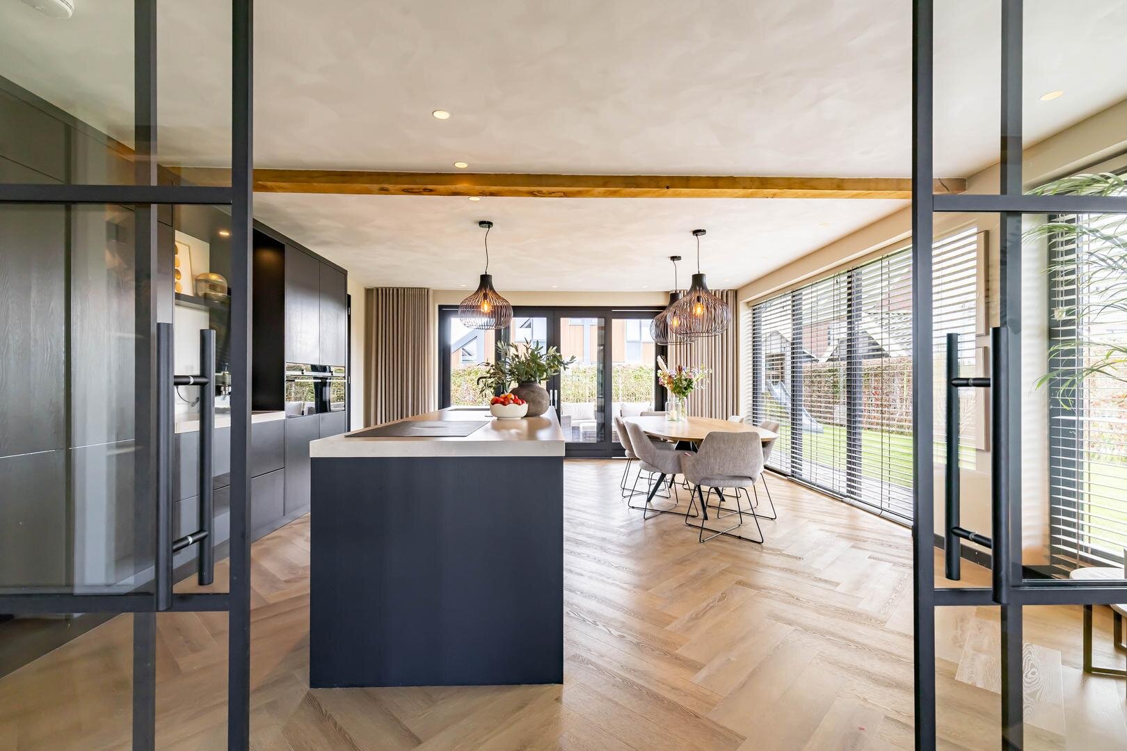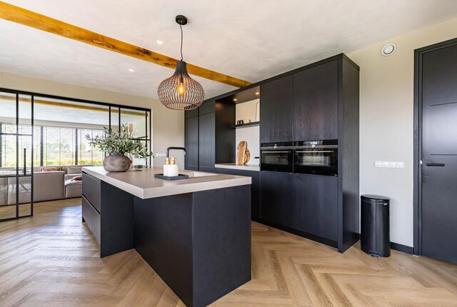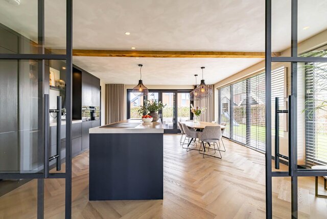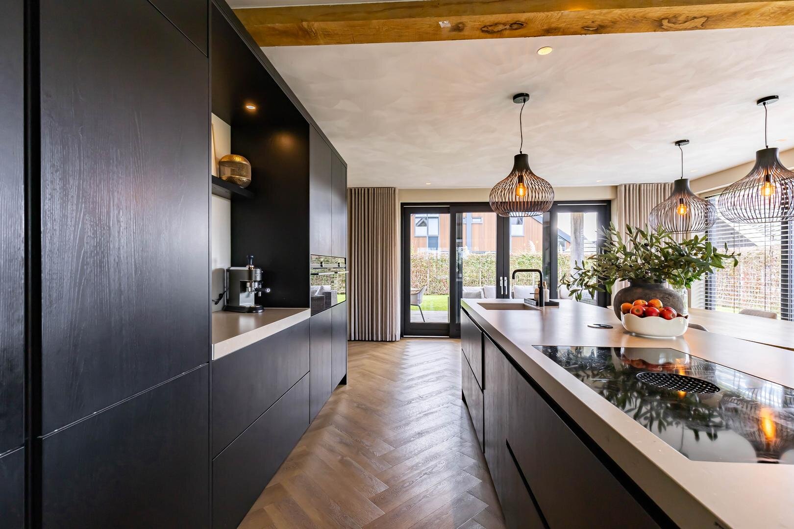 Het hart van de woning op de begane grond is de royale woonkamer van 38 m², die naadloos aansluit op de woonkeuken van 37 m² en deze zijn van elkaar gescheiden middels een moderne stalen schuifdeuren en volledig voorzien van een fraaie visgraat PVC vloer. De moderne keuken met kookeiland is uitgerust met alle nodige voorzieningen, zoals een een inductiekookplaat met geïntegreerde afzuiging (Bora), grote koeler, grote vriezer, vaatwasser, oven, combi-magnetron en Quooker. Bijkeuken met kastenwand met witgoedaansluitingen en veel bergruimte plus een deur naar de tuin en toegang naar de technische ruimte. Vanuit de woonkamer een schuifpui naar een vlonderterras, beschut door de doorlopende kap van de schuurwoning.