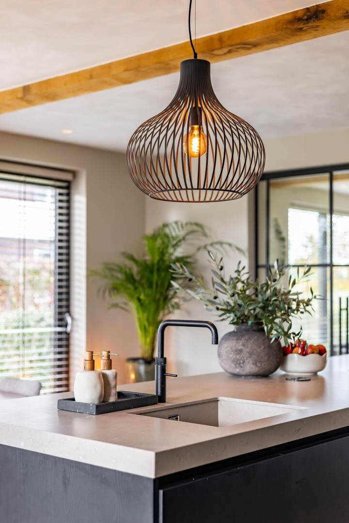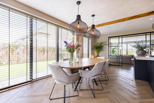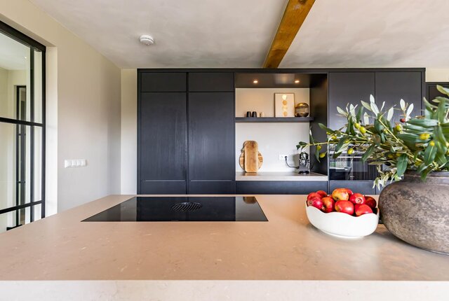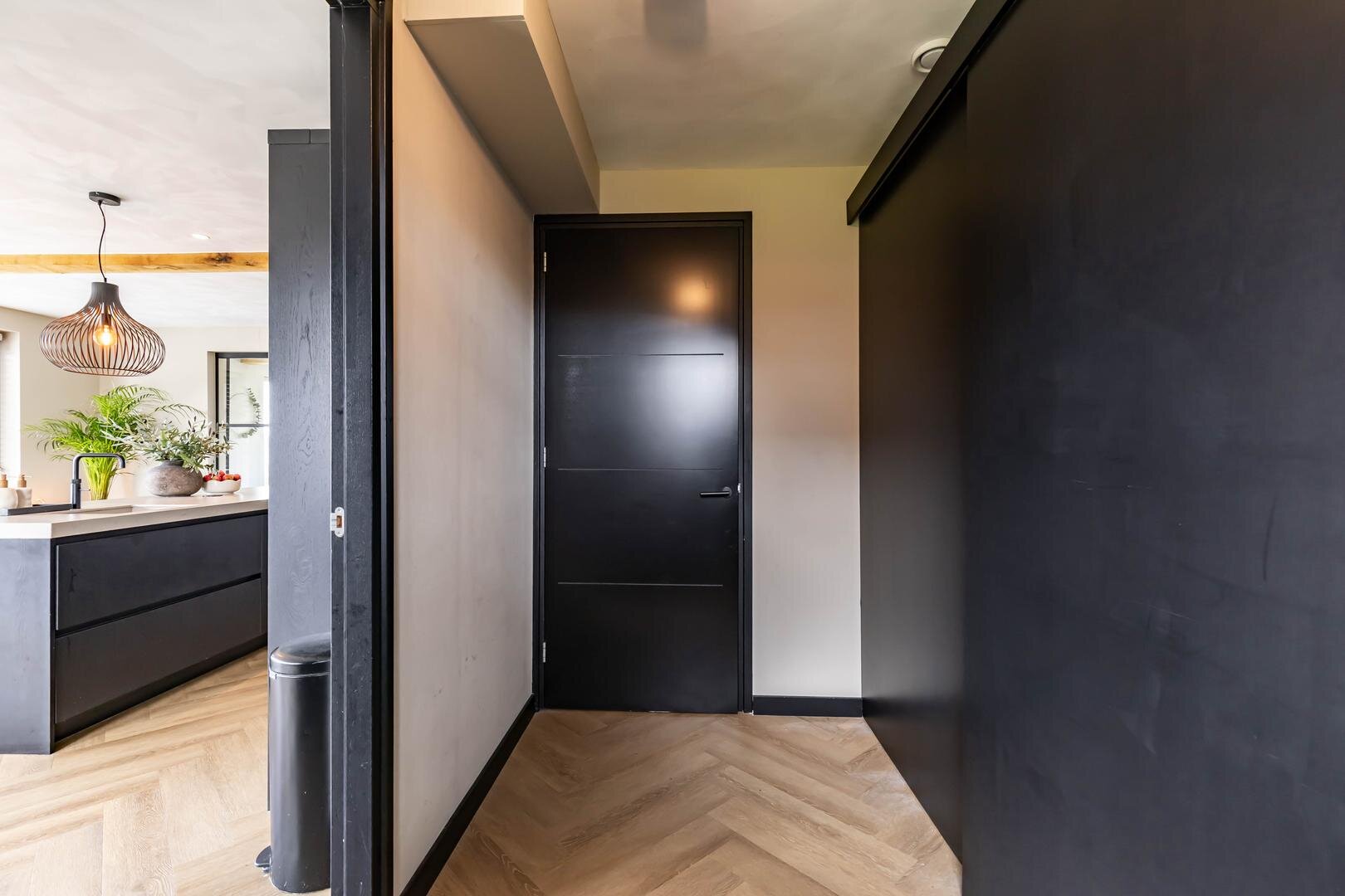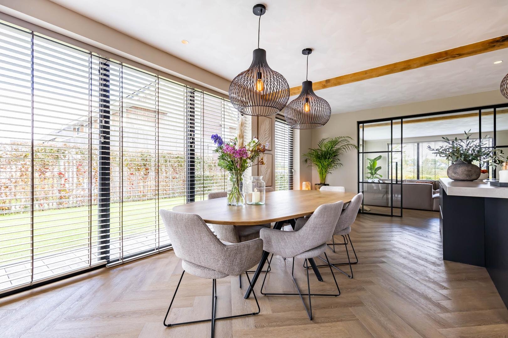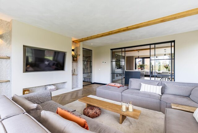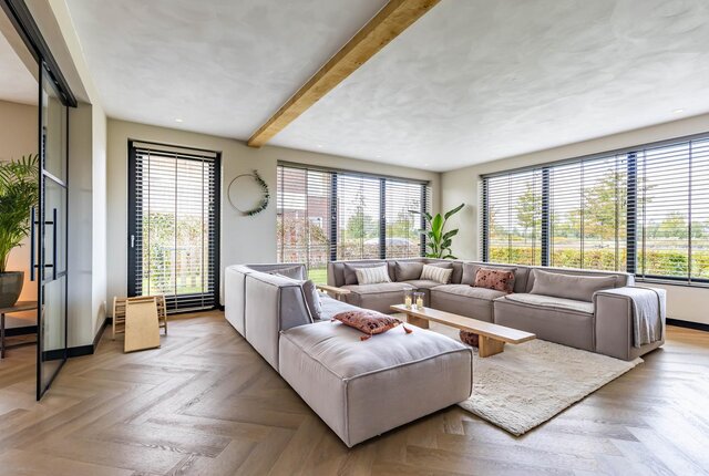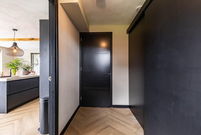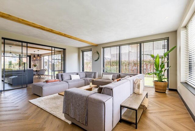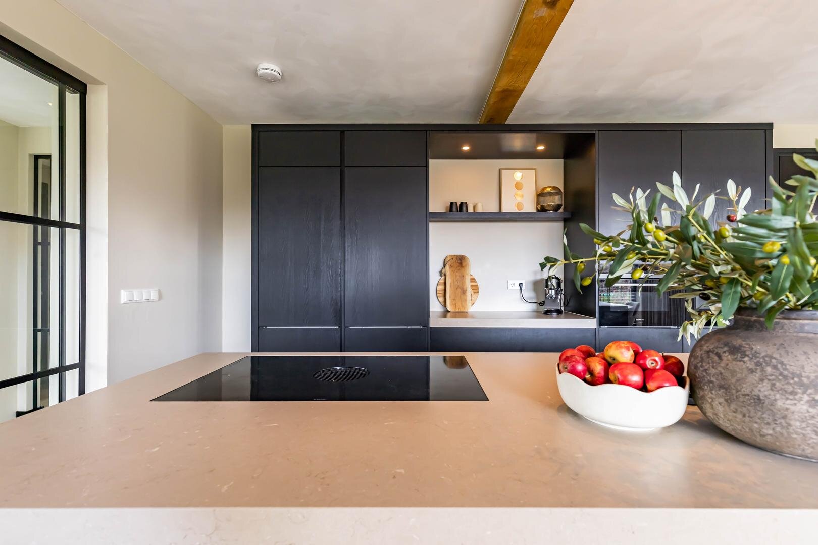 Het hart van de woning op de begane grond is de royale woonkamer van 38 m², die naadloos aansluit op de woonkeuken van 37 m² en deze zijn van elkaar gescheiden middels een moderne stalen schuifdeuren en volledig voorzien van een fraaie visgraat PVC vloer. De moderne keuken met kookeiland is uitgerust met alle nodige voorzieningen, zoals een een inductiekookplaat met geïntegreerde afzuiging (Bora), grote koeler, grote vriezer, vaatwasser, oven, combi-magnetron en Quooker. Bijkeuken met kastenwand met witgoedaansluitingen en veel bergruimte plus een deur naar de tuin en toegang naar de technische ruimte. Vanuit de woonkamer een schuifpui naar een vlonderterras, beschut door de doorlopende kap van de schuurwoning.