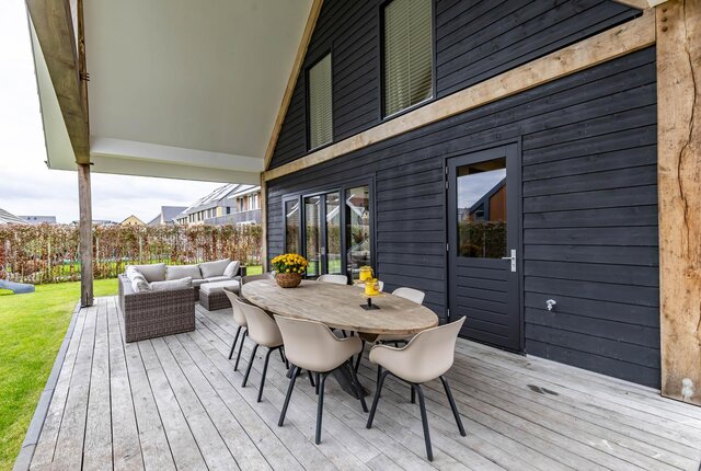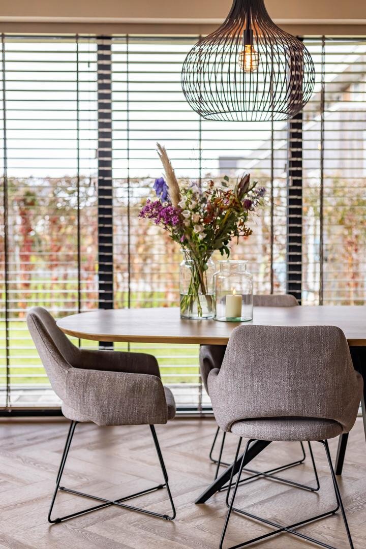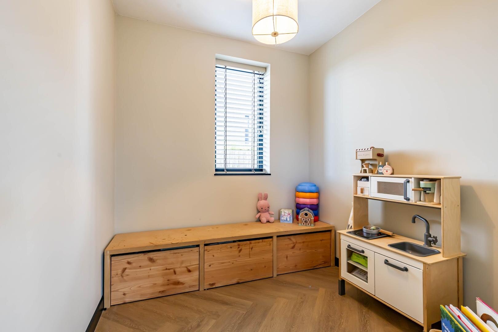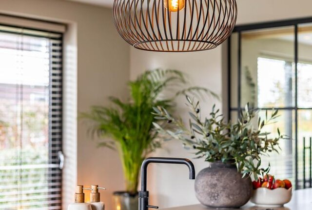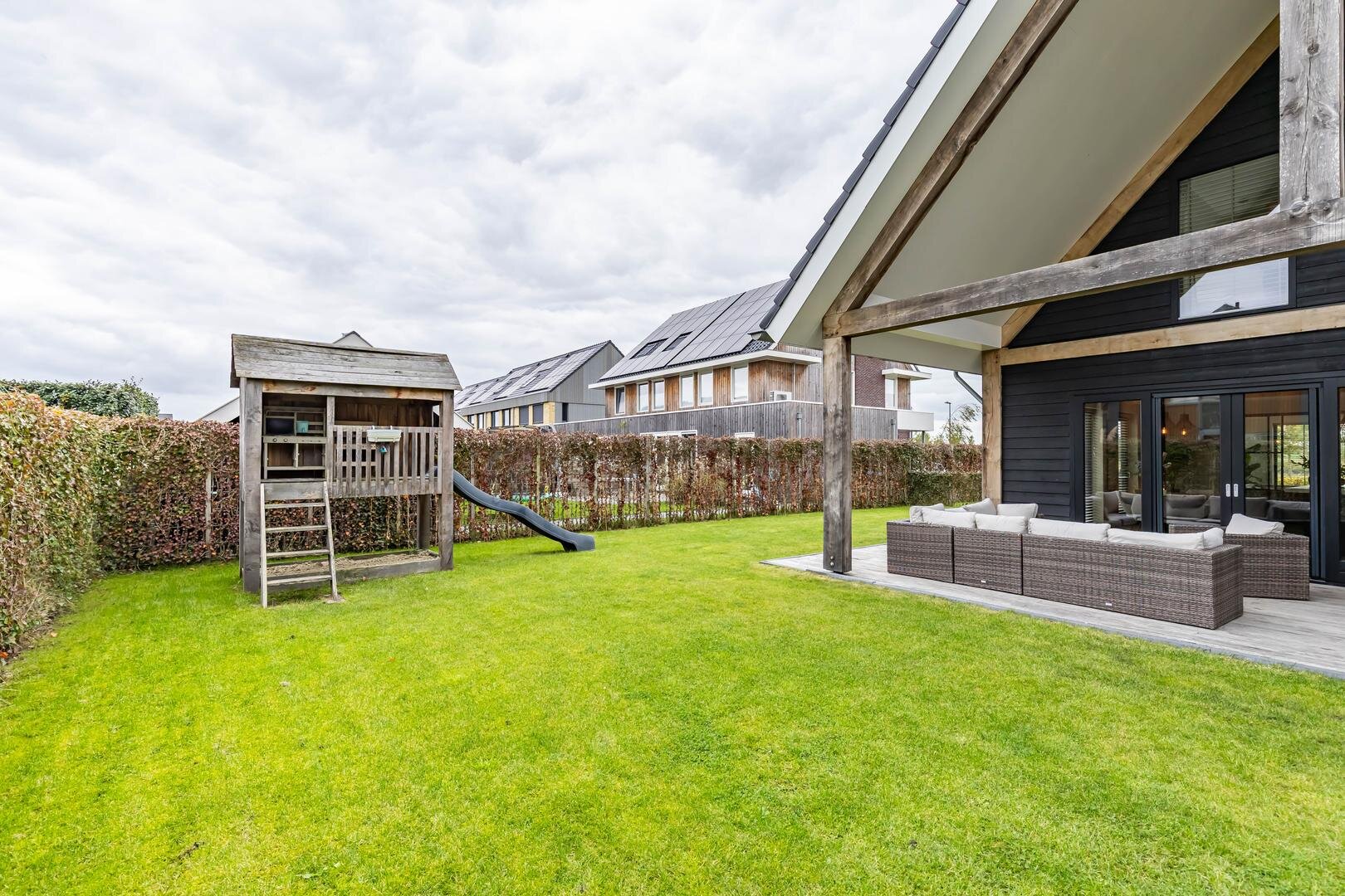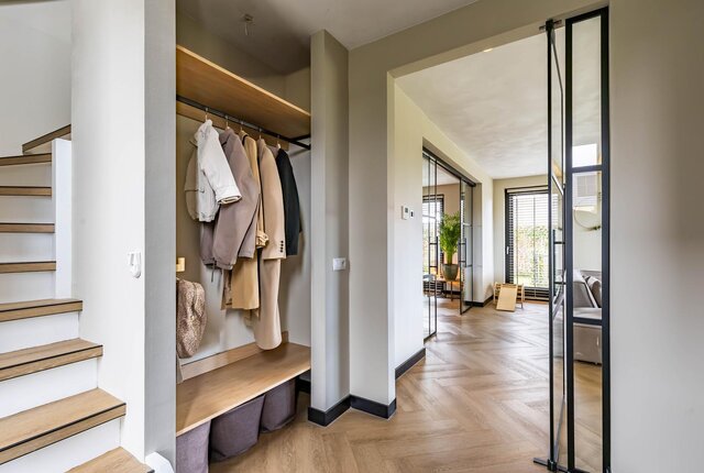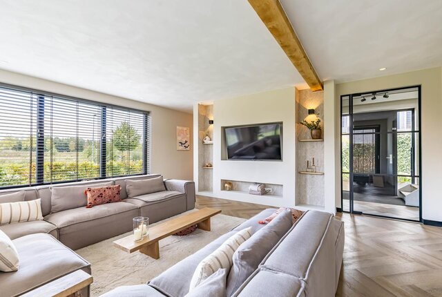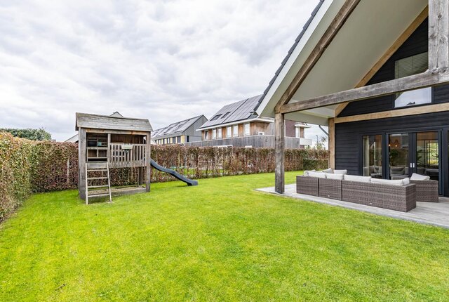Het hart van de woning op de begane grond is de royale woonkamer van 38 m², die naadloos aansluit op de woonkeuken van 37 m² en deze zijn van elkaar gescheiden middels een moderne stalen schuifdeuren en volledig voorzien van een fraaie visgraat PVC vloer. De moderne keuken met kookeiland is uitgerust met alle nodige voorzieningen, zoals een een inductiekookplaat met geïntegreerde afzuiging (Bora), grote koeler, grote vriezer, vaatwasser, oven, combi-magnetron en Quooker. Bijkeuken met kastenwand met witgoedaansluitingen en veel bergruimte plus een deur naar de tuin en toegang naar de technische ruimte. Vanuit de woonkamer een schuifpui naar een vlonderterras, beschut door de doorlopende kap van de schuurwoning.
