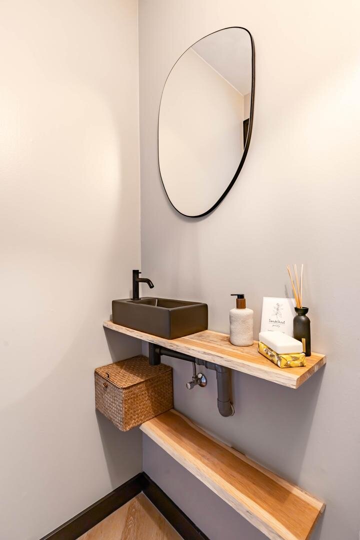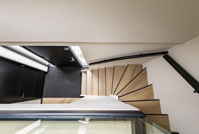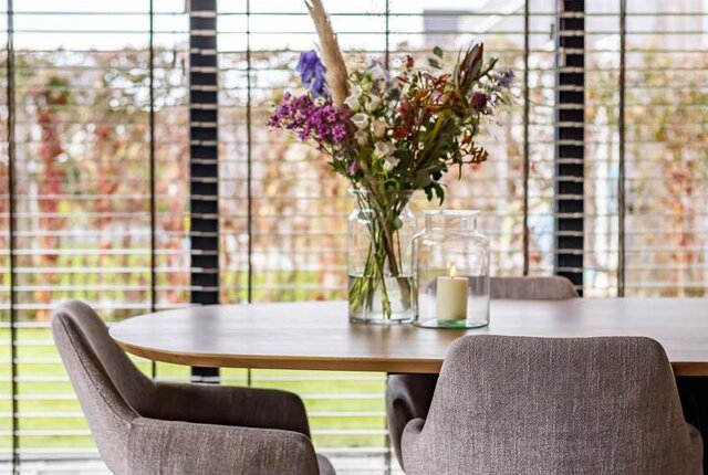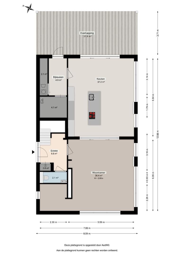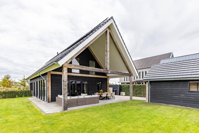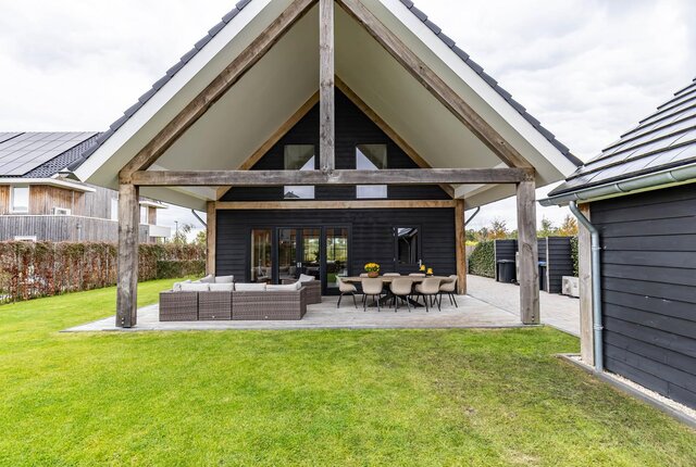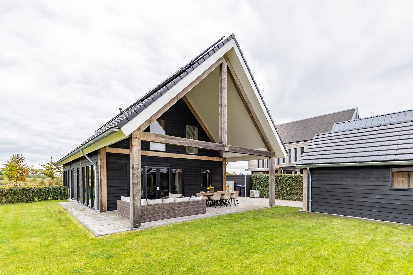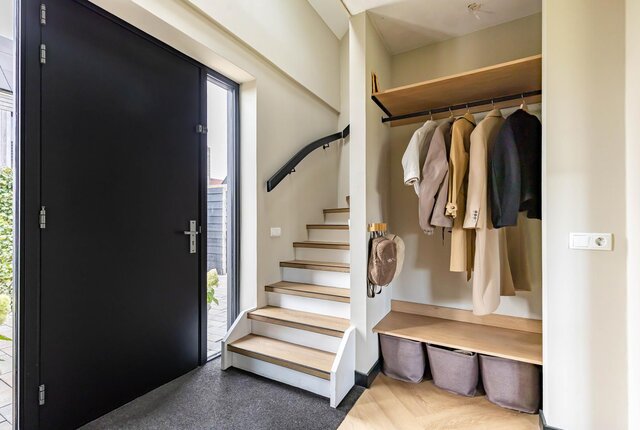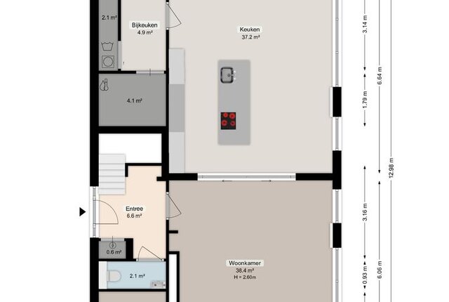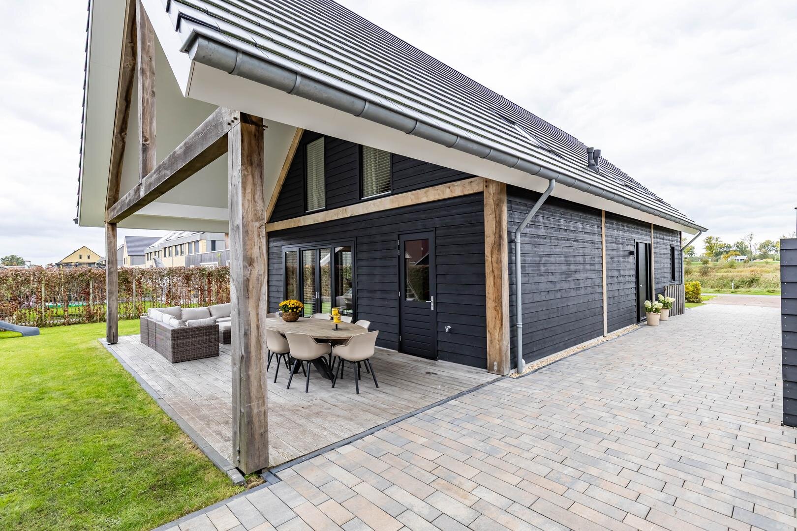 Het hart van de woning op de begane grond is de royale woonkamer van 38 m², die naadloos aansluit op de woonkeuken van 37 m² en deze zijn van elkaar gescheiden middels een moderne stalen schuifdeuren en volledig voorzien van een fraaie visgraat PVC vloer. De moderne keuken met kookeiland is uitgerust met alle nodige voorzieningen, zoals een een inductiekookplaat met geïntegreerde afzuiging (Bora), grote koeler, grote vriezer, vaatwasser, oven, combi-magnetron en Quooker. Bijkeuken met kastenwand met witgoedaansluitingen en veel bergruimte plus een deur naar de tuin en toegang naar de technische ruimte. Vanuit de woonkamer een schuifpui naar een vlonderterras, beschut door de doorlopende kap van de schuurwoning.