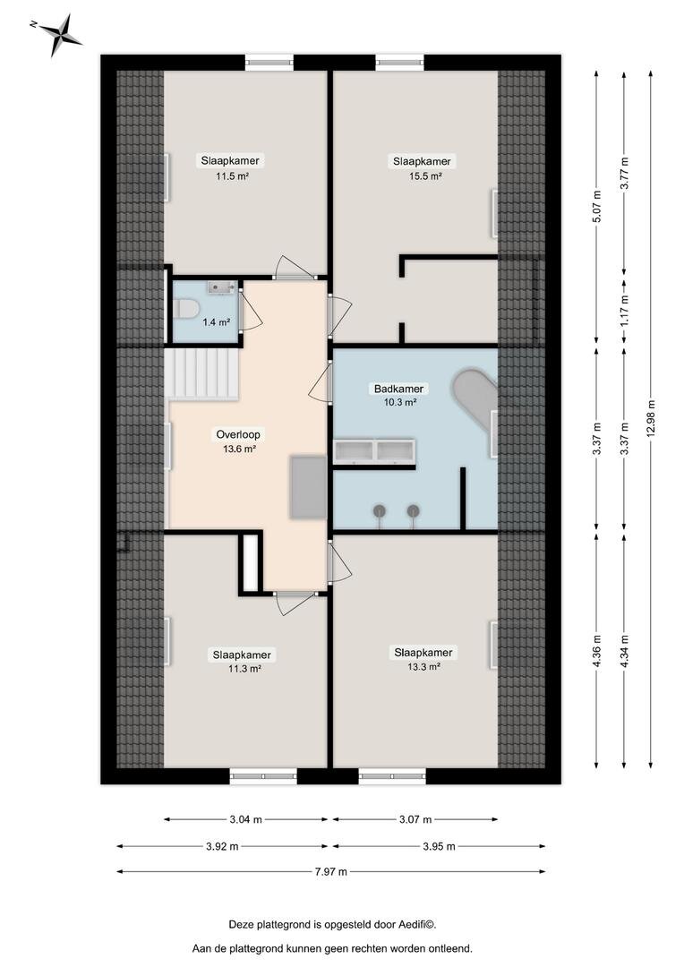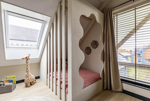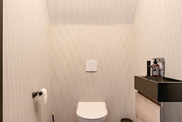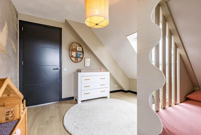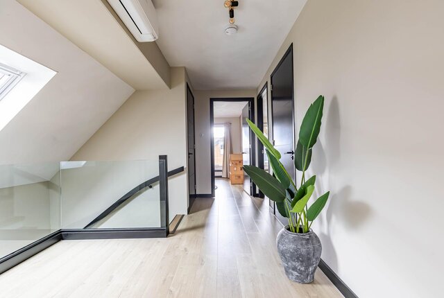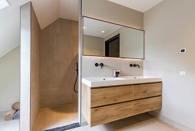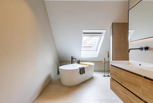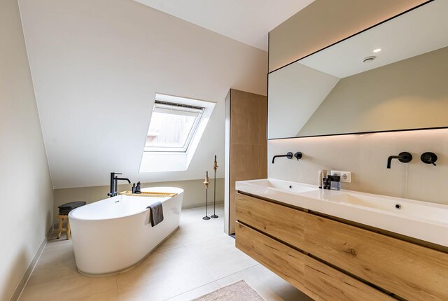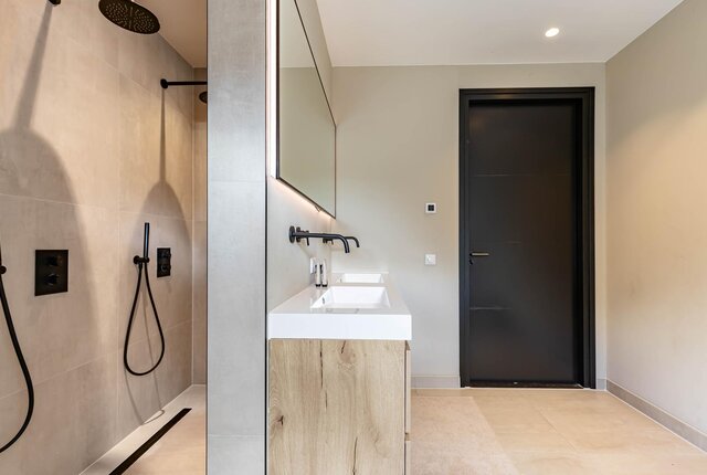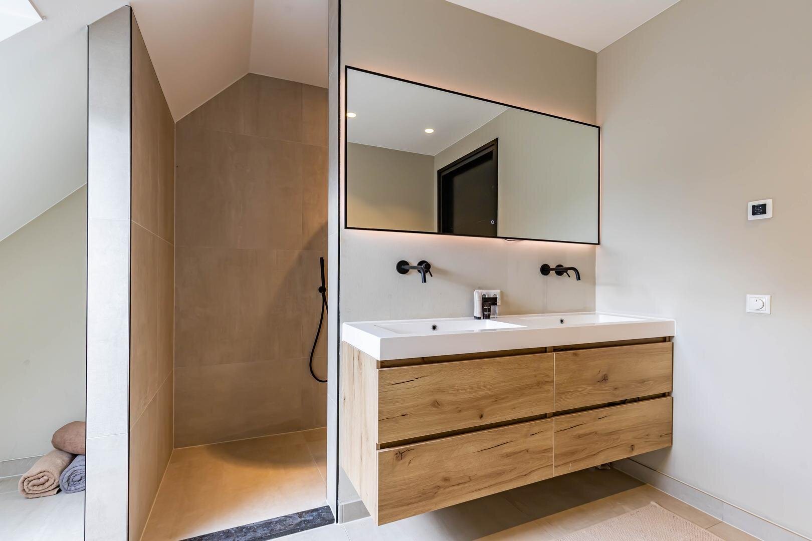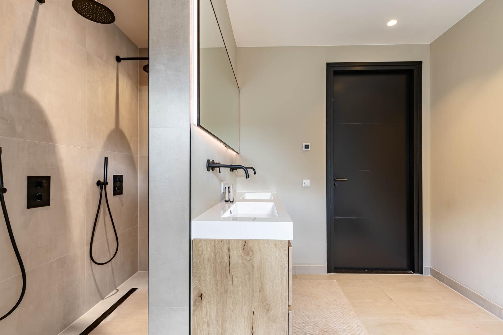 De bovenste verdieping heeft 4 slaapkamers geheel voorzien van pvc vloer en vloerverwarming, inclusief een luxueuze badkamer. Met een oppervlakte van 10 m², is de badkamer voorzien van een ligbad, dubbele wastafelmeubel, inloopdouche met dubbele douchekop en vloerverwarming om je comfort te garanderen.