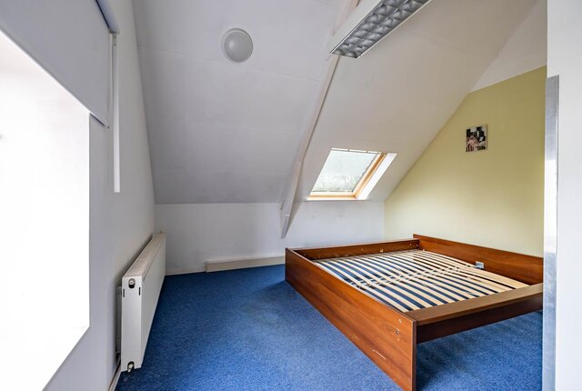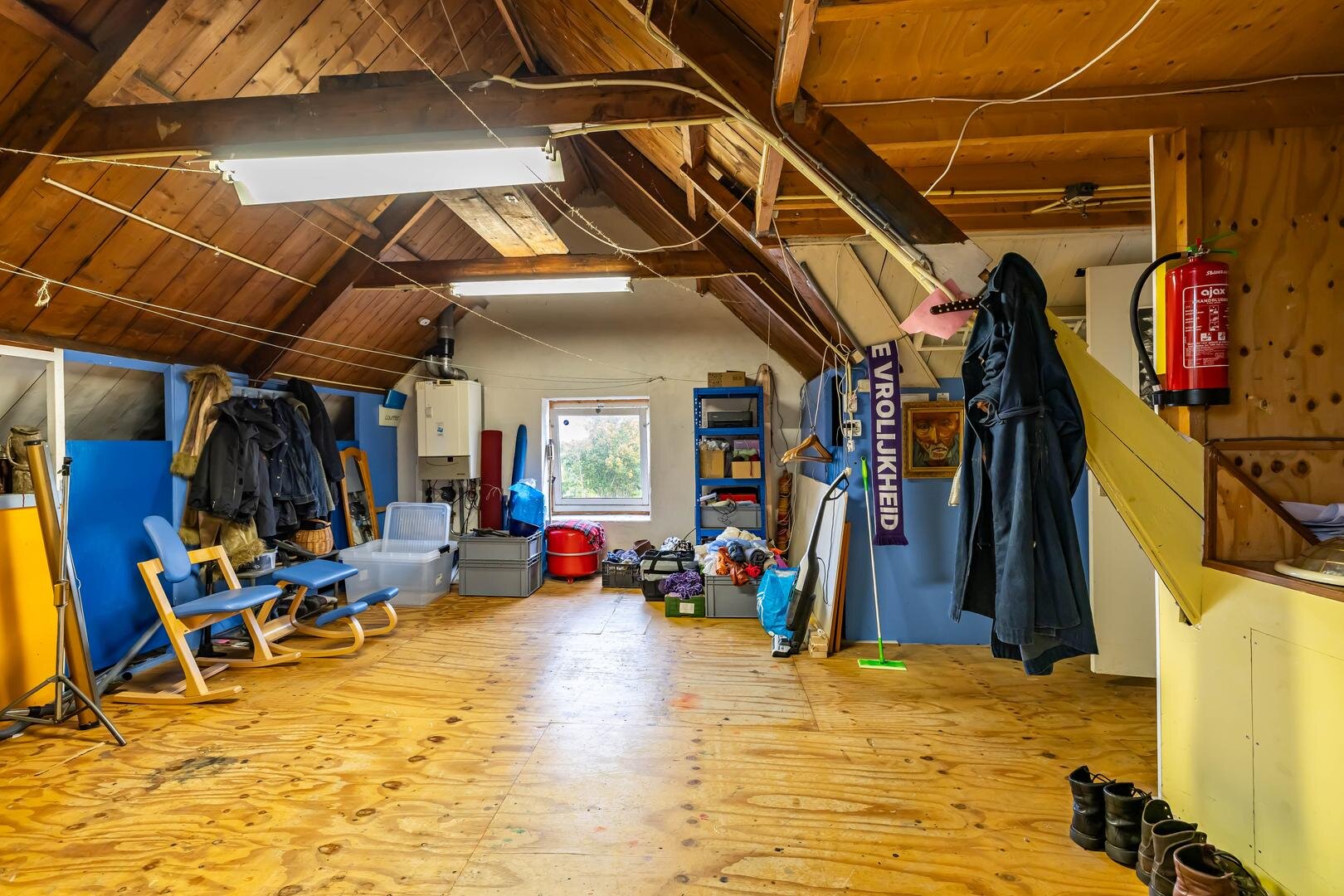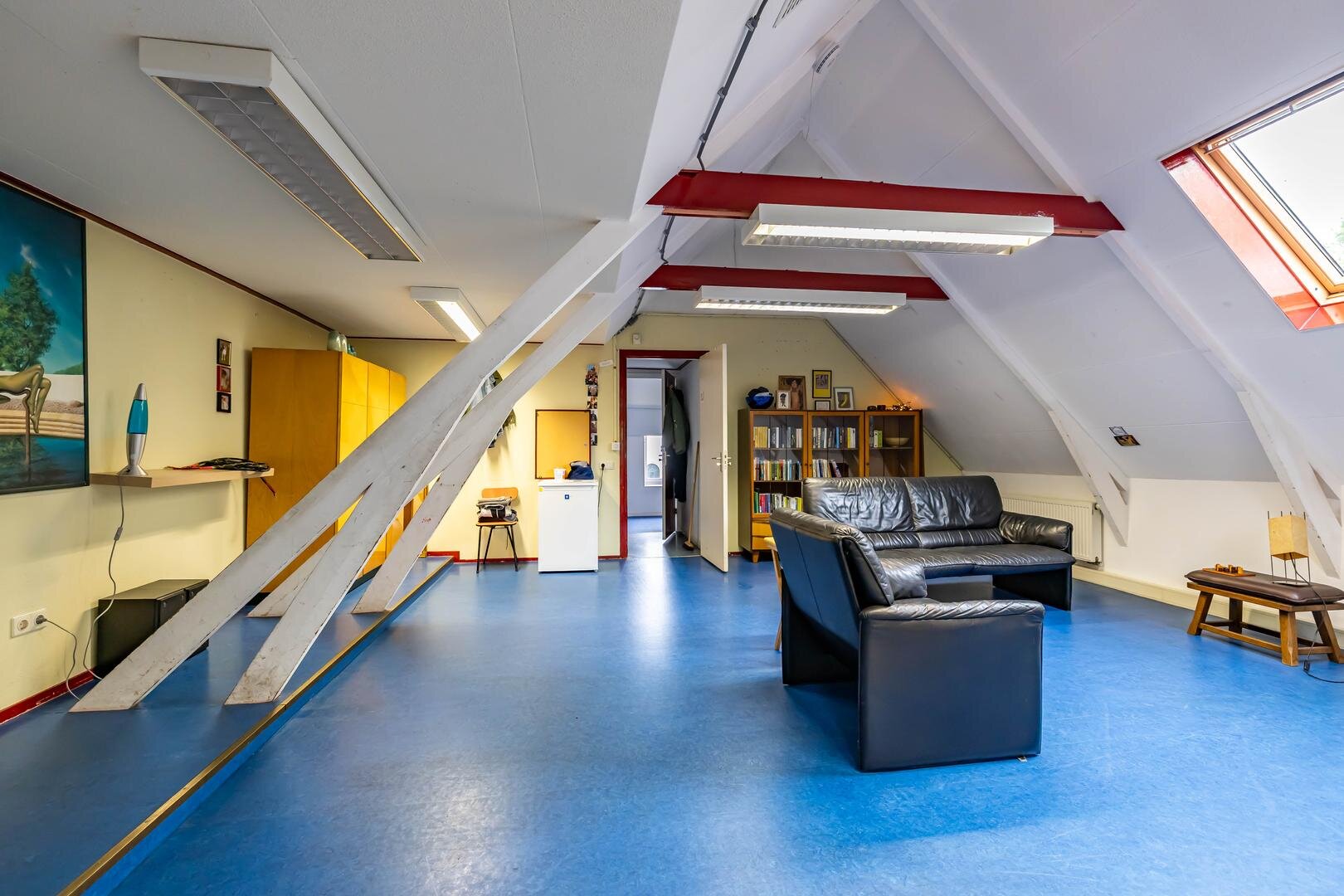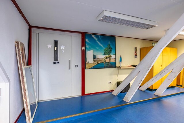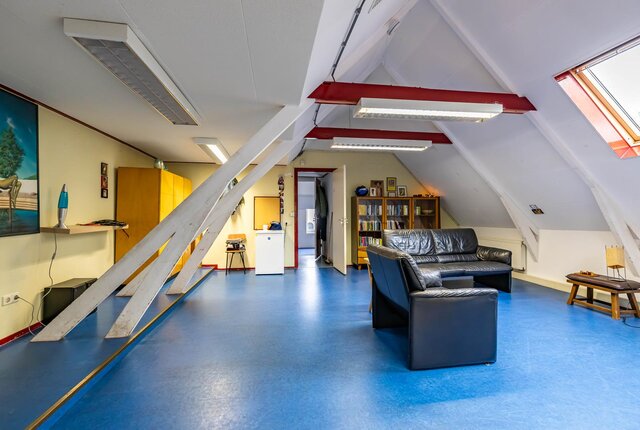 Op de eerste verdieping kom je eerst op de overloop en een ruime hal met bergruimte. Op deze verdieping bevinden zich ook 2 grote (les)lokalen van respectievelijk 42m2 en 57m2. Daarnaast is er nog een kamer van circa 12m2 en een ruime bergzolder van circa 28m2. De twee grote lokalen zijn voorzien van dakramen, linoleumvloer, uitgang naar buiten en airco. Tevens heeft één van de ruimtes ook toegang tot de lift.