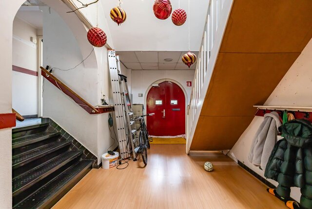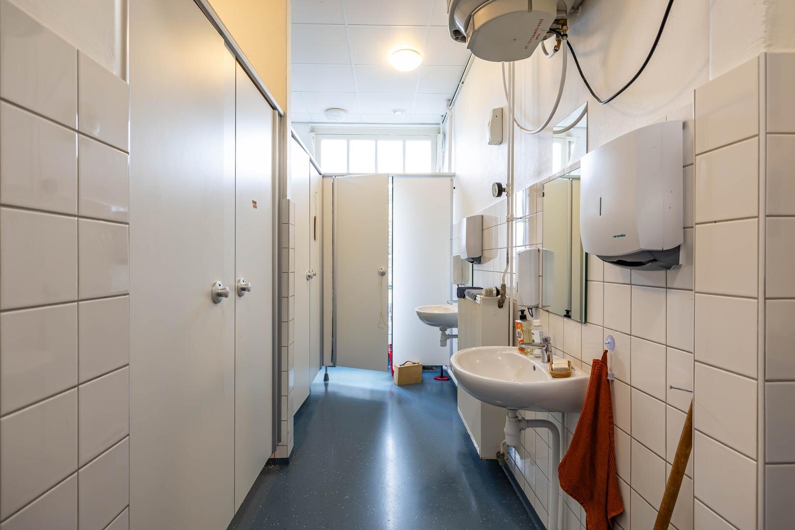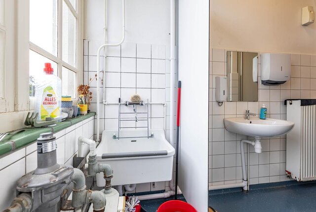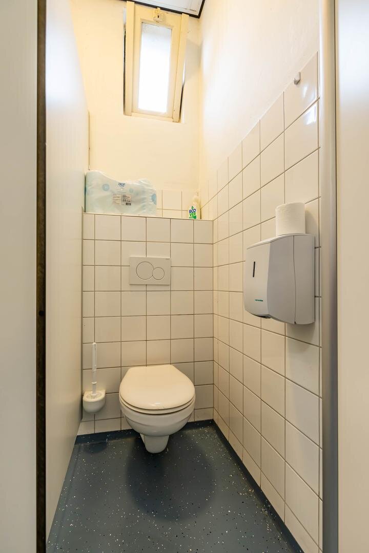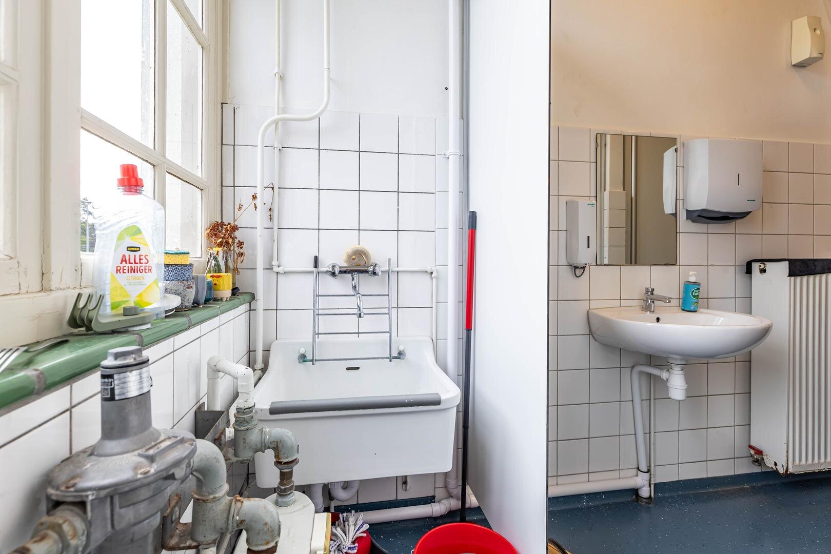 Centrale en ruime entree van circa 18m2 met trapopgang en lift, plus de gang (circa 9m2) naar de achteruitgang en het oorspronkelijke schoolplein. Vanuit een verhoogde hal is er toegang naar de ruime kelder van circa 34 m2, een gemeenschappelijk keuken van circa 14m2 en de badkamer van circa 15m2 voorzien een douche, 4 toiletten, 2 wastafels en opstelling voor de witgoed. Warmwater wordt voorzien van een elektrische boiler (zowel in de badkamer als in de keuken). De drie (les)lokalen zijn respectievelijk circa 52m2, 52m2 en 59m2 groot en zijn alle drie voorzien van een vaste trap naar een vide (hoogte van circa 1.80m en circa 14m2 tot 16m2 groot) verder voorzien van grote ramen en linoleumvloer.