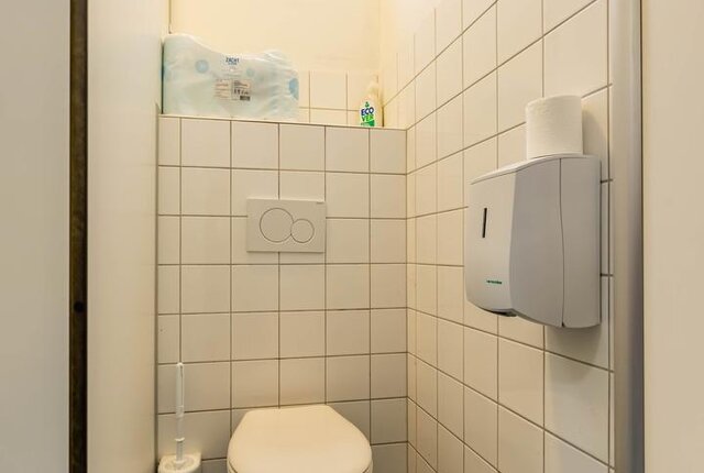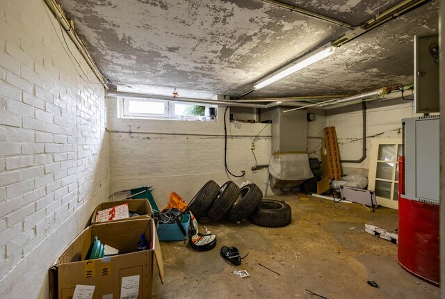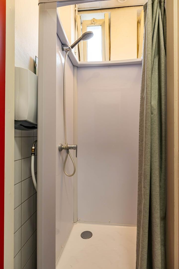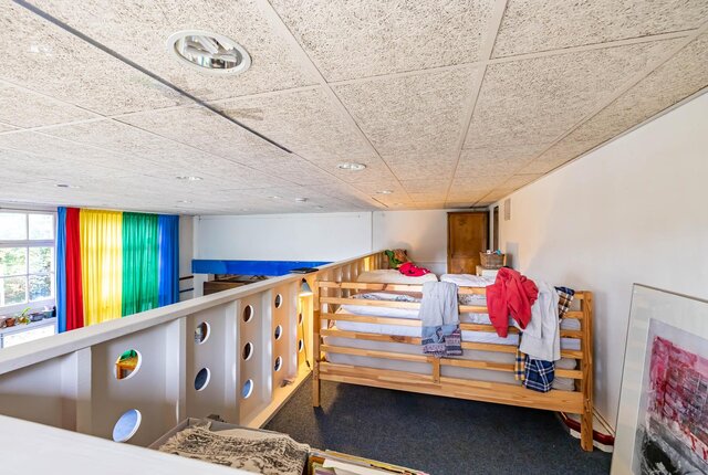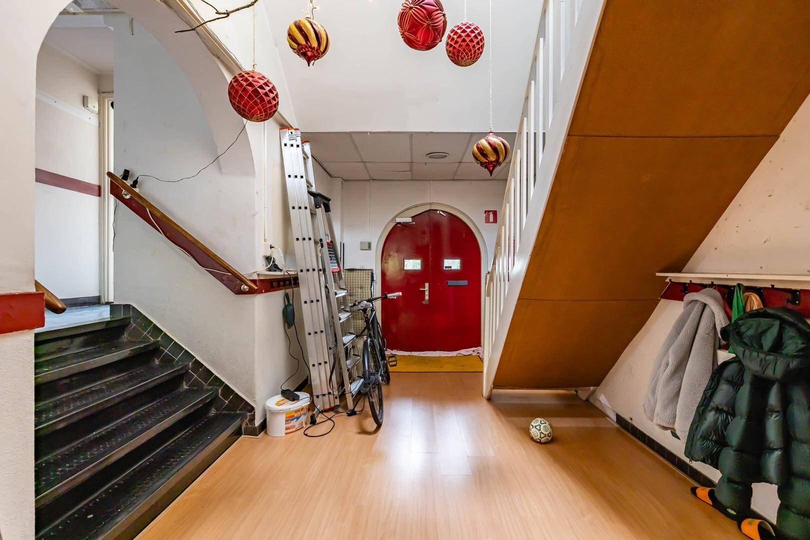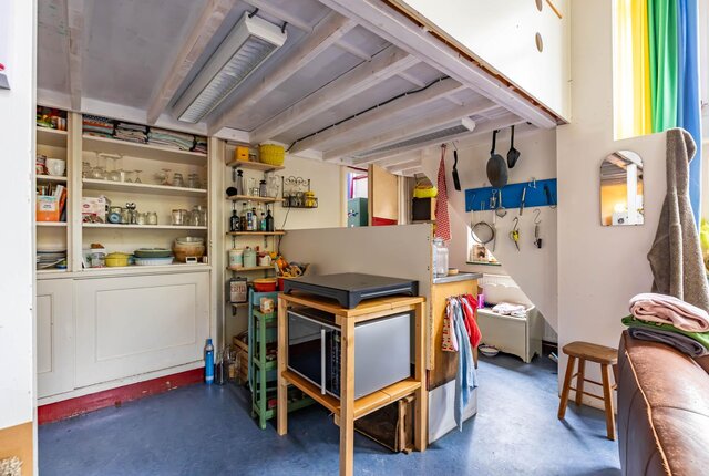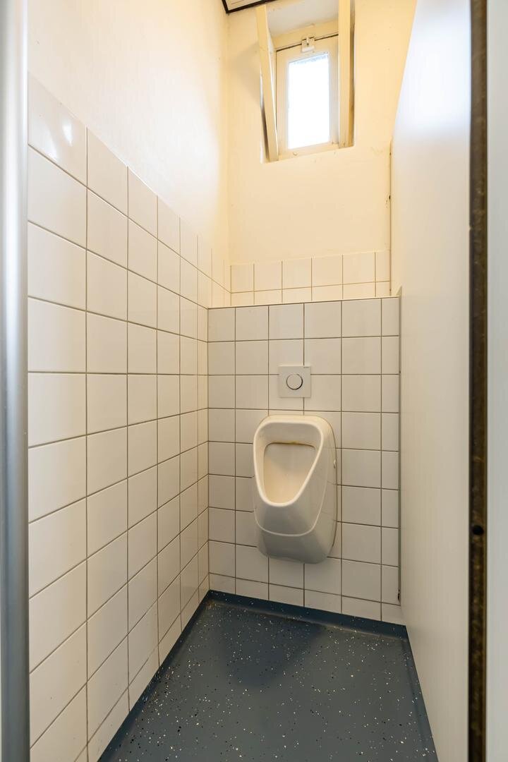 Centrale en ruime entree van circa 18m2 met trapopgang en lift, plus de gang (circa 9m2) naar de achteruitgang en het oorspronkelijke schoolplein. Vanuit een verhoogde hal is er toegang naar de ruime kelder van circa 34 m2, een gemeenschappelijk keuken van circa 14m2 en de badkamer van circa 15m2 voorzien een douche, 4 toiletten, 2 wastafels en opstelling voor de witgoed. Warmwater wordt voorzien van een elektrische boiler (zowel in de badkamer als in de keuken). De drie (les)lokalen zijn respectievelijk circa 52m2, 52m2 en 59m2 groot en zijn alle drie voorzien van een vaste trap naar een vide (hoogte van circa 1.80m en circa 14m2 tot 16m2 groot) verder voorzien van grote ramen en linoleumvloer.
