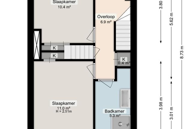 Op de tweede verdieping bevinden zich twee slaapkamers van ca. 11 en 10 m². Beide kamers zijn voorzien van praktische inbouwkasten. Aan de voorzijde is de nette badkamer van 5m² met douche en wastafel te vinden. Er is op deze verdieping ook een separaat toilet voorzien van wandcloset en fonteintje. Op deze verdieping is ook nog een tweede balkon aanwezig.