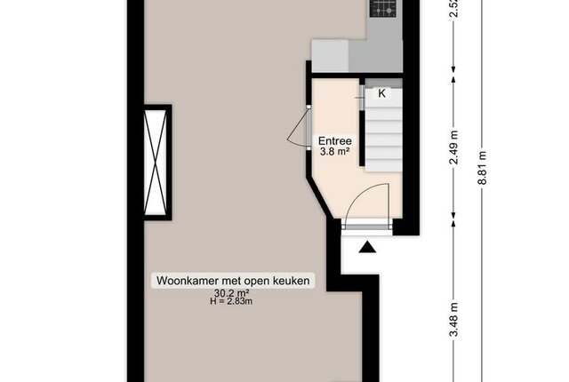 Kom binnen bij nummer 3b via de eigen voordeur op de eerste verdieping. Hier kom je binnen in de hal met de trap naar de verdiepingen en toegang tot de woonkamer met open keuken. Deze lichte ruimte is maar liefst 30 m² en biedt genoeg plek voor zowel een royale zithoek en een grote eettafel. De open keuken is aan de achterzijde van de woning gesitueerd en is voorzien van diverse inbouwapparatuur zoals een gasfornuis, afzuigkap, oven, koelkast met vriesvak en een vaatwasser.