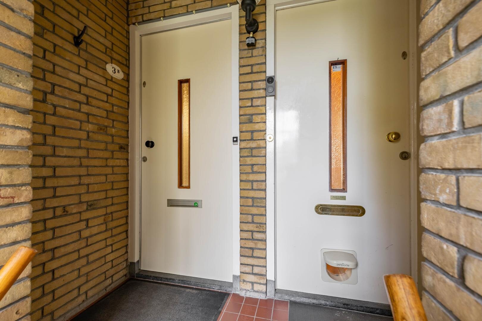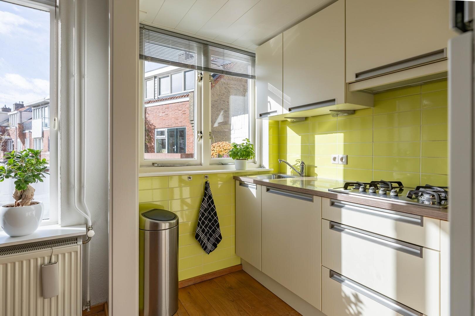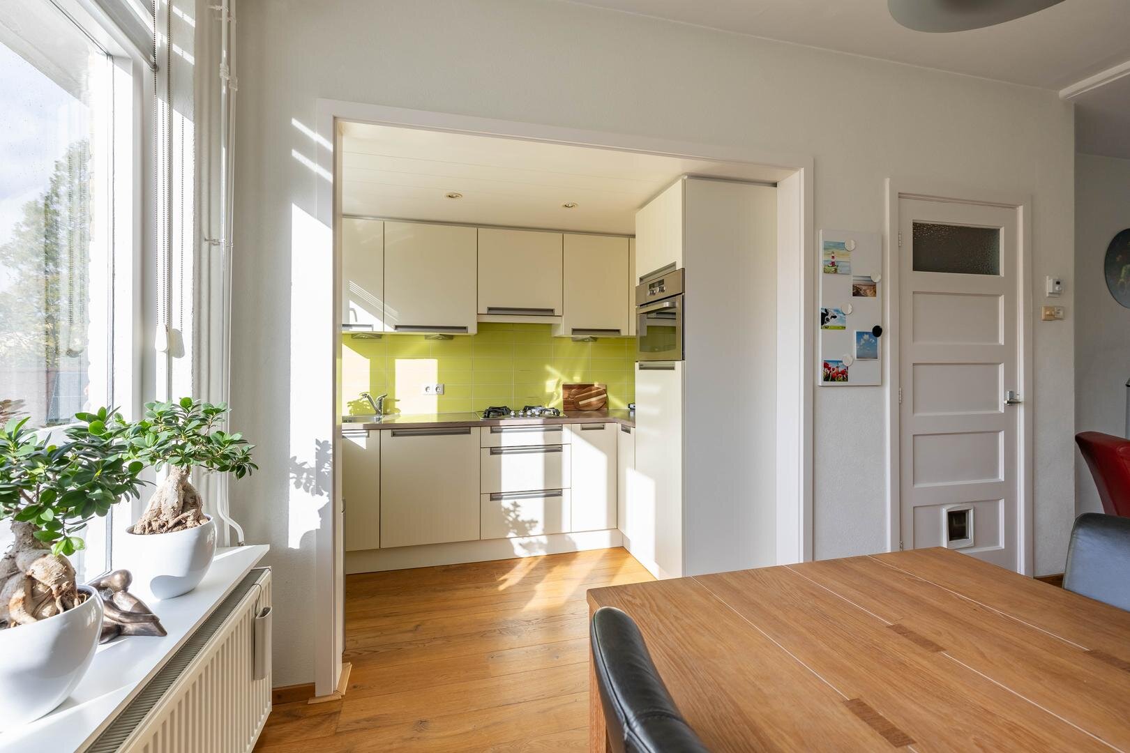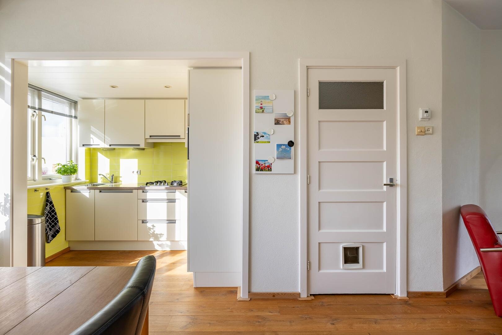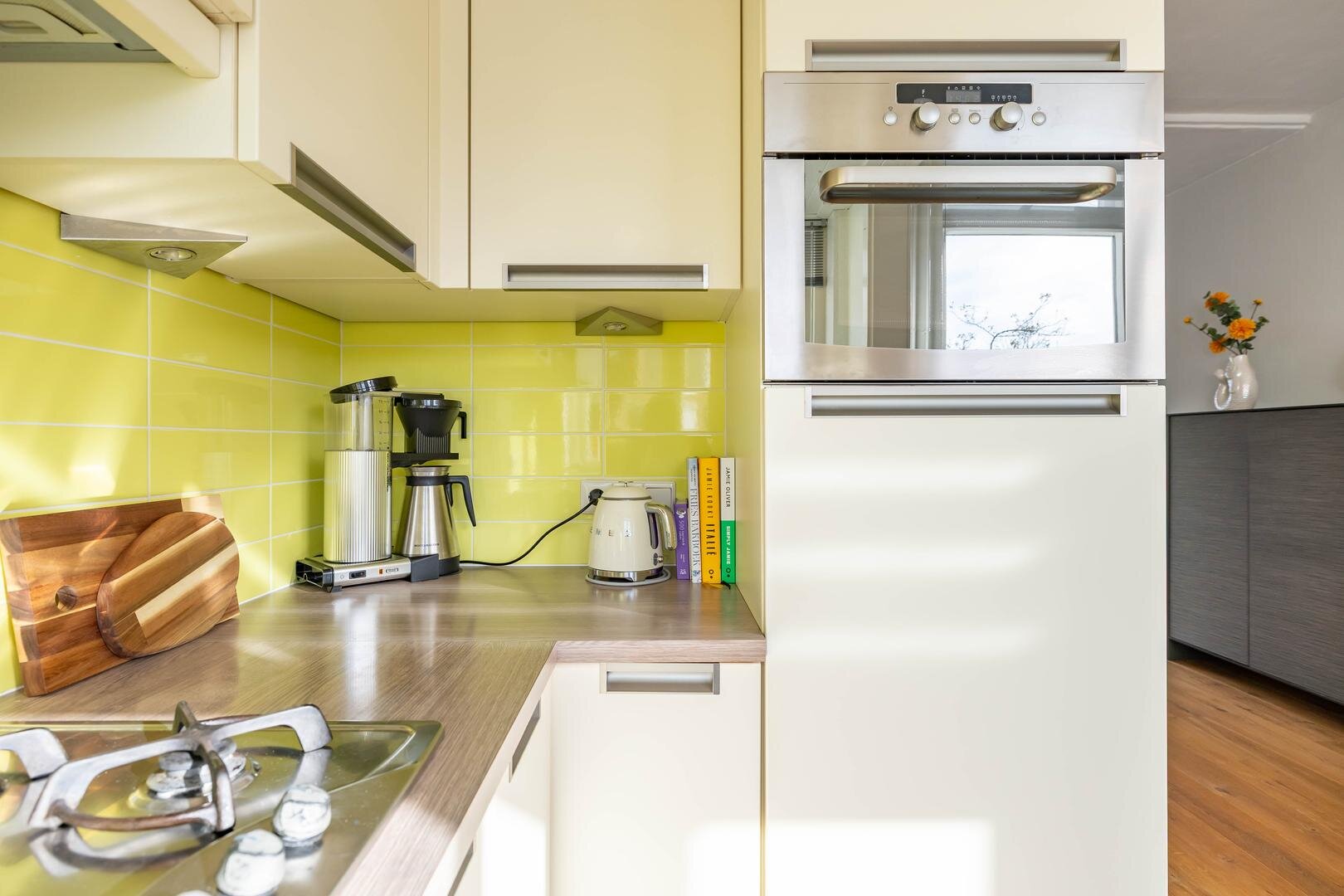 Kom binnen bij nummer 3b via de eigen voordeur op de eerste verdieping. Hier kom je binnen in de hal met de trap naar de verdiepingen en toegang tot de woonkamer met open keuken. Deze lichte ruimte is maar liefst 30 m² en biedt genoeg plek voor zowel een royale zithoek en een grote eettafel. De open keuken is aan de achterzijde van de woning gesitueerd en is voorzien van diverse inbouwapparatuur zoals een gasfornuis, afzuigkap, oven, koelkast met vriesvak en een vaatwasser.