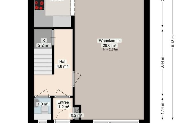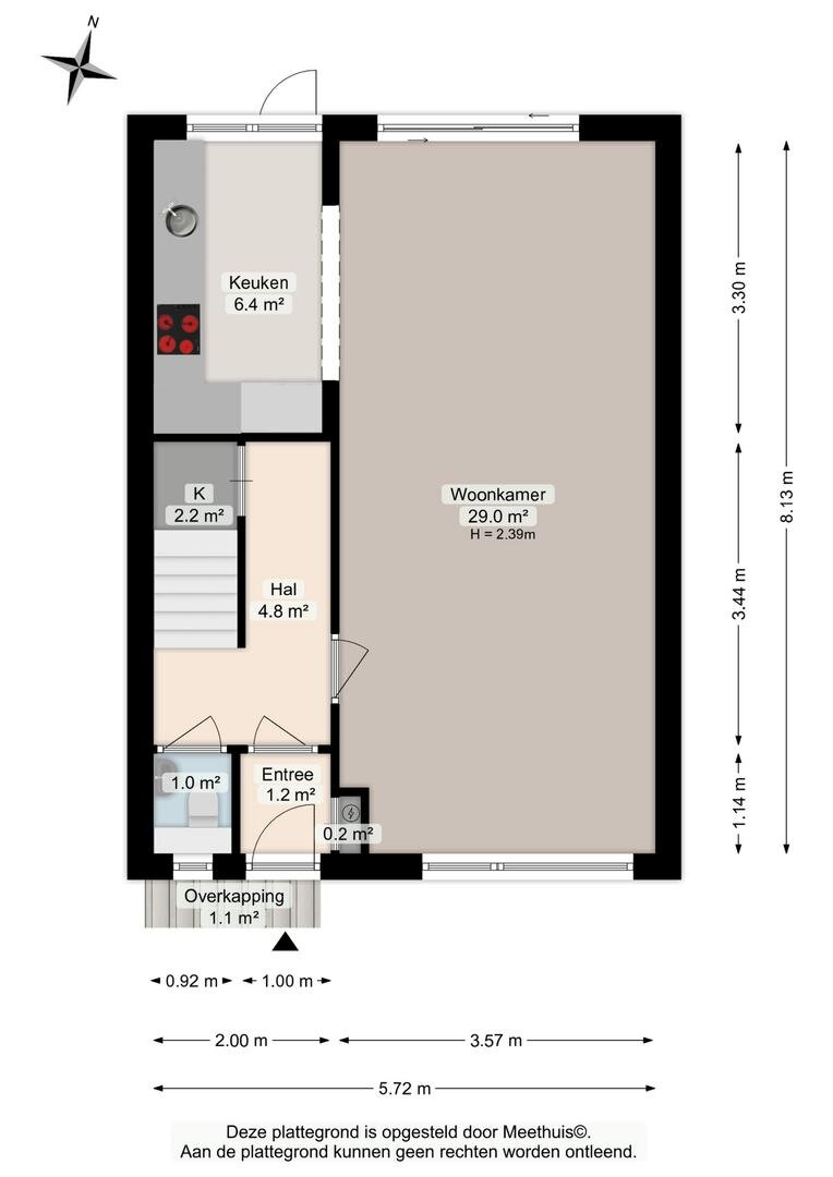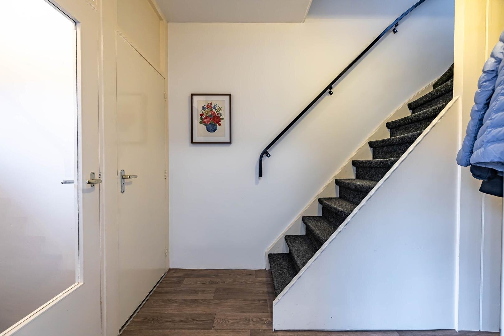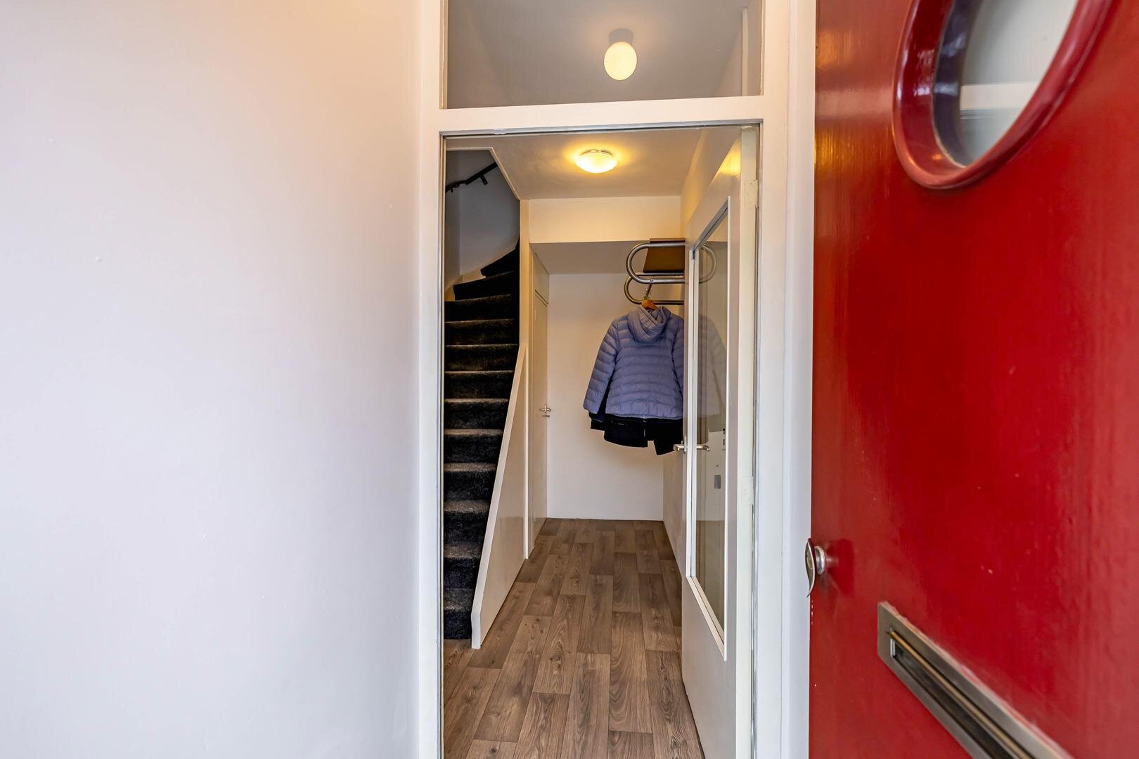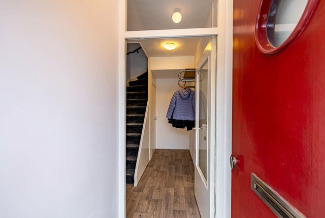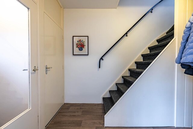 Er is een entree waar ook de meterkast (moderne groepenkast) is met een tochtportaal, een heel ruime hal met handige trapkast, waar veel bergruimte is.