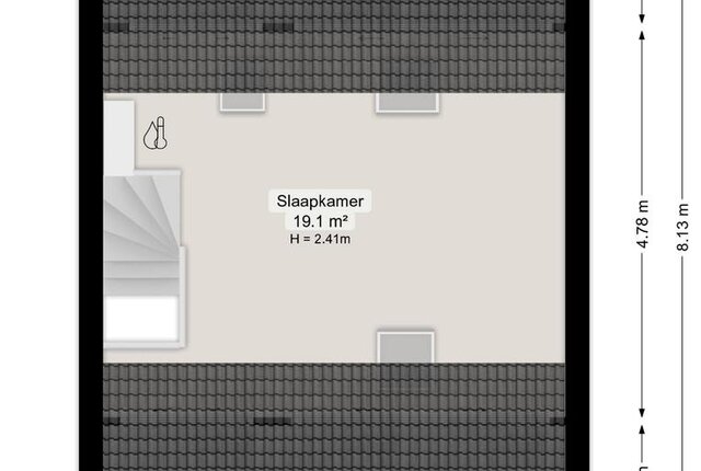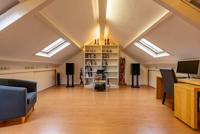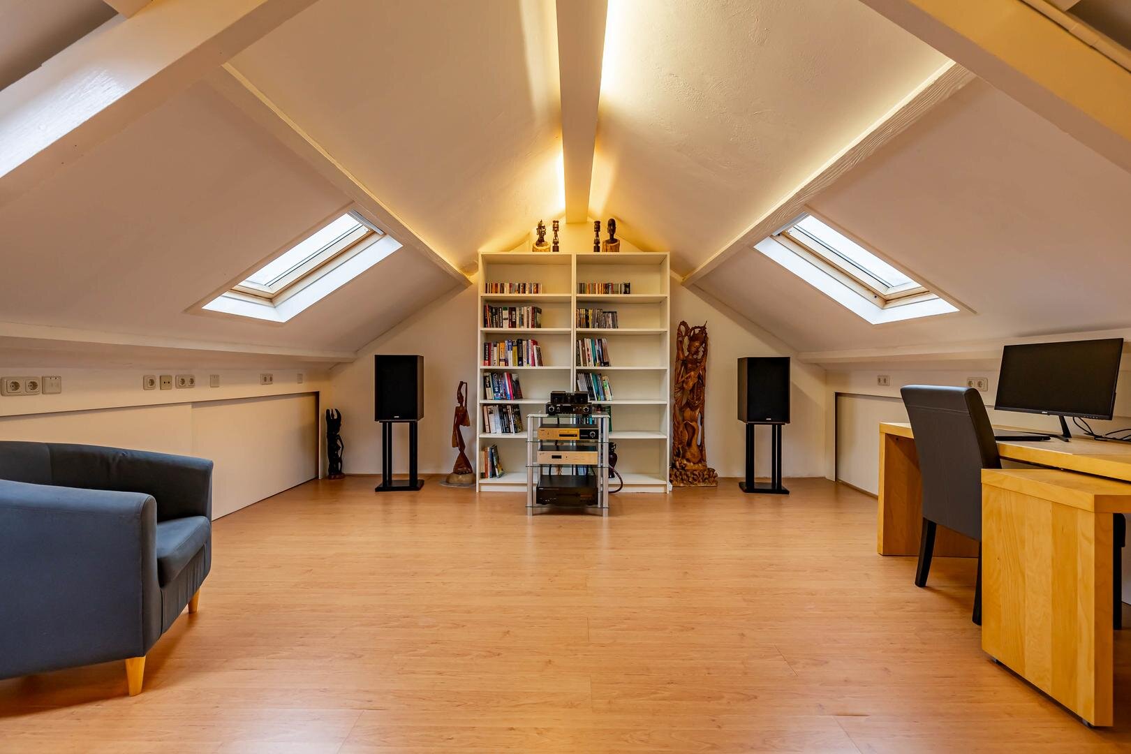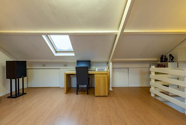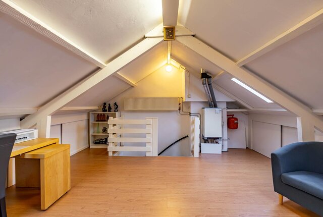 Wat een enorme multifunctionele ruimte is dit. Er is met gemak een wand in te plaatsen waardoor een aparte afgesloten zolderkamer gemaakt kan worden, nu een grote open ruimte met veel lichtinval door de twee grote dakramen. Zie je het al voor je? Je eigen fitnessruimte of heerlijke thuis-bioscoop? Hier kan het!