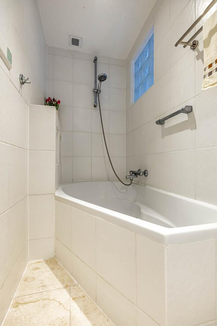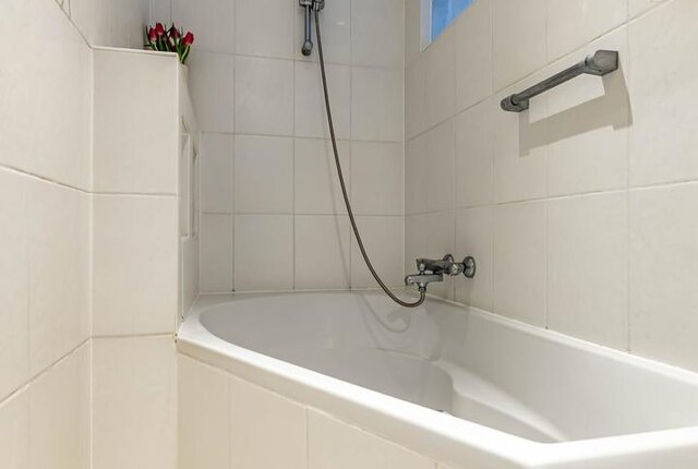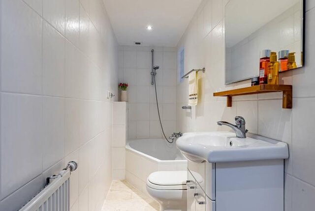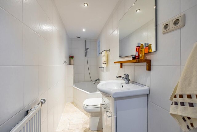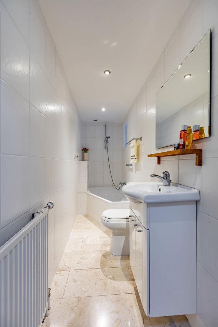 De badkamer is slim gesitueerd en vergroot door vaste kasten te verwijderen en de ruimte toe te voegen aan de badkamer, Er is een bad-/douche combinatie met een vast wastafelmeubel en een tweede toilet. Ook deze ruimte is heel netjes en licht door de speelse “glas-blok elementen”.