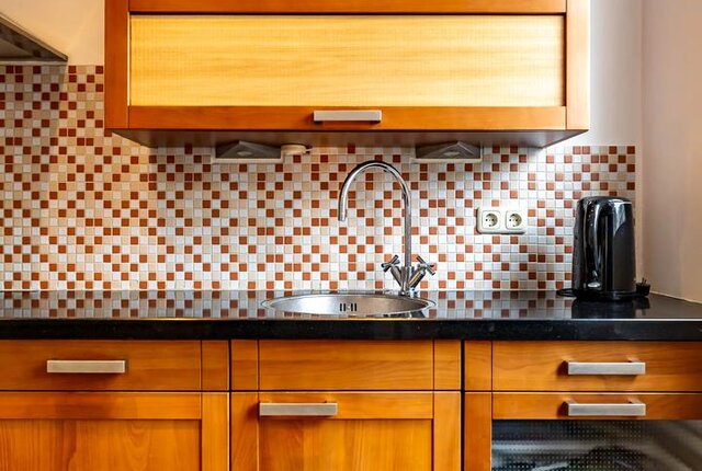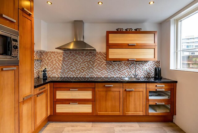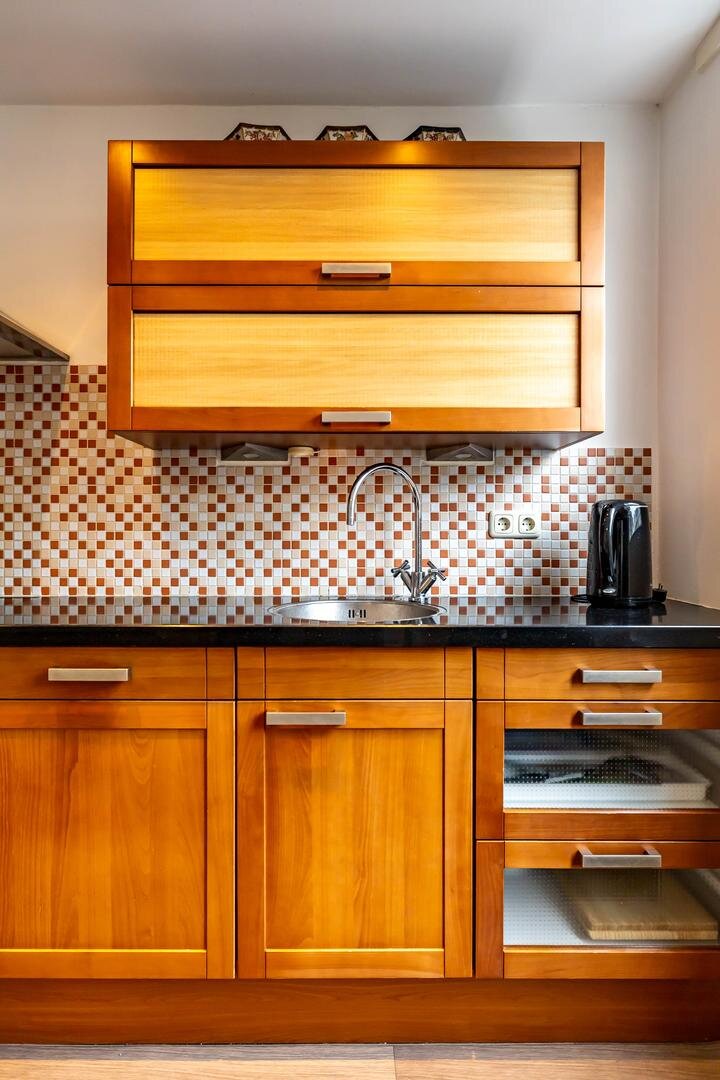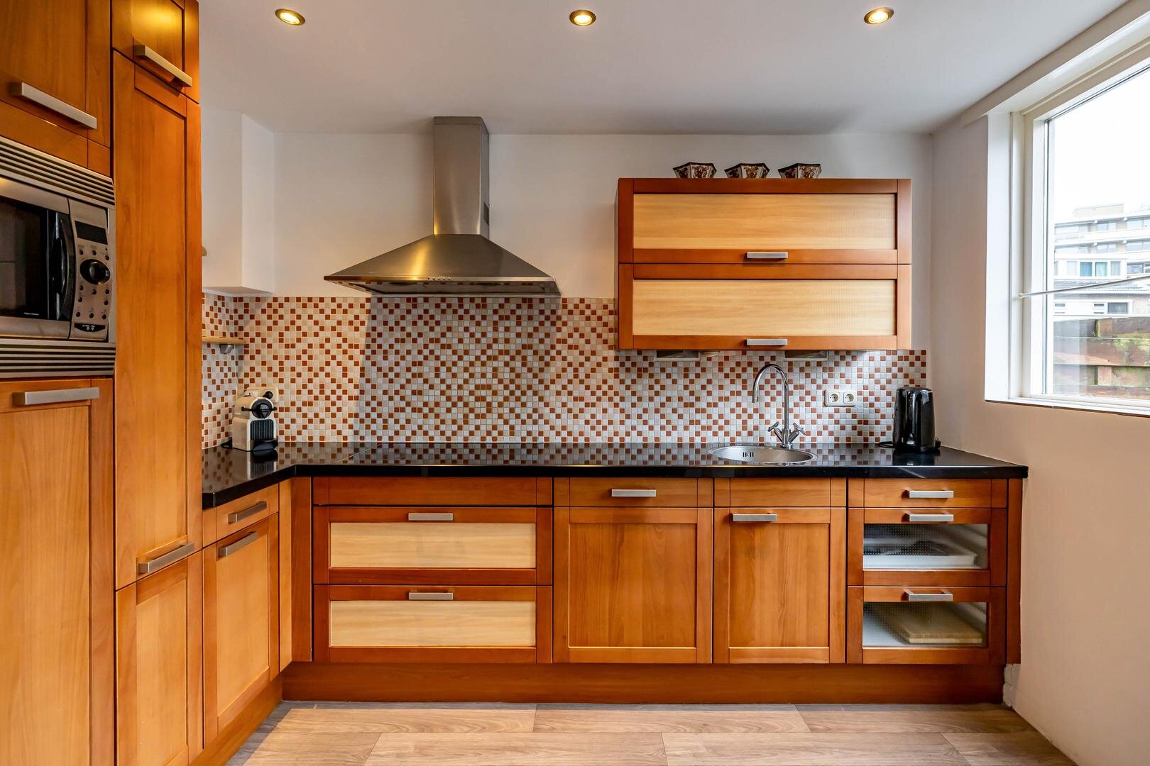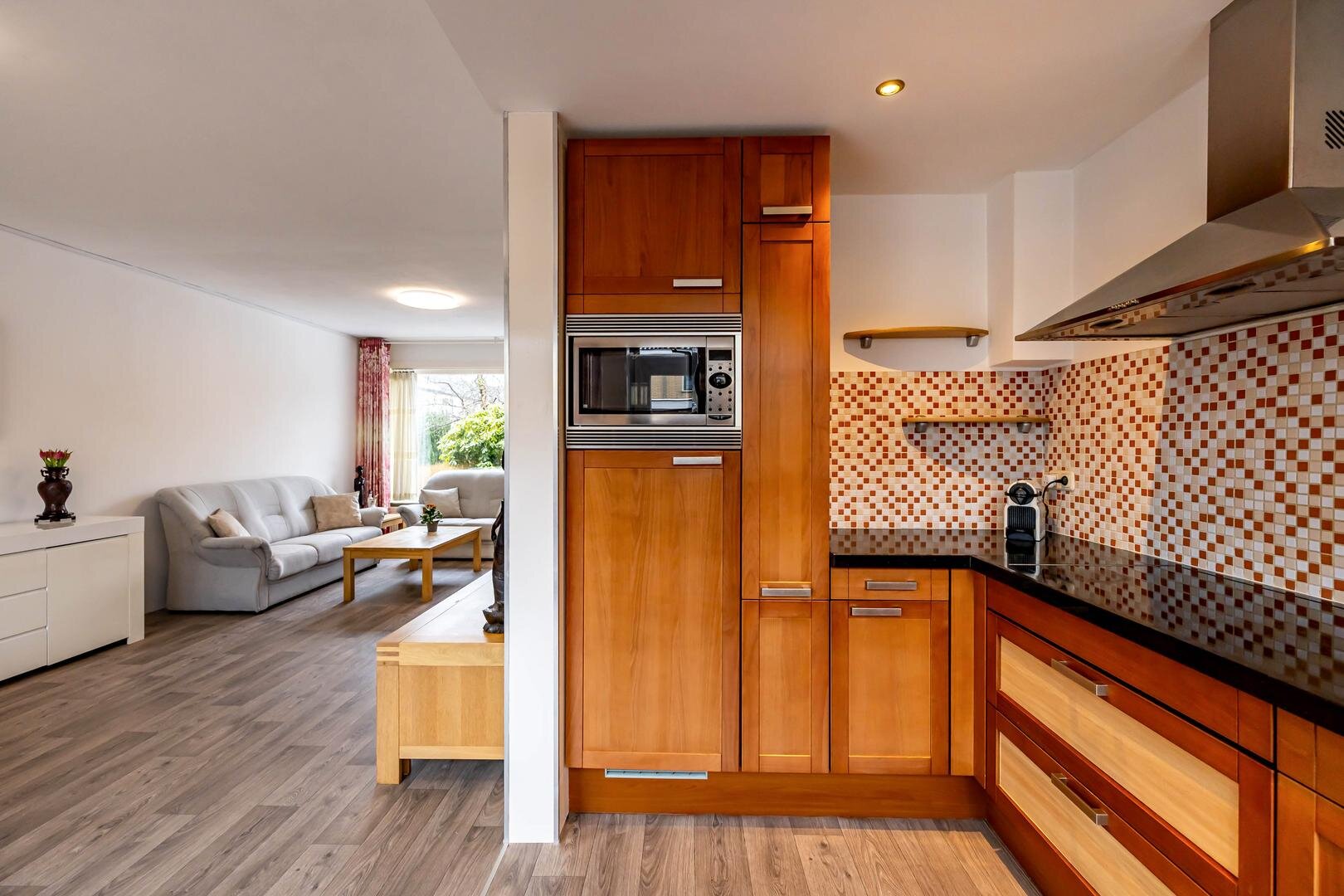 De in hoek opgestelde keuken is heel netjes en voorzien van koelkast, combi oven- magnetron, inductie kookplaat, afzuigkap en vaatwasser.