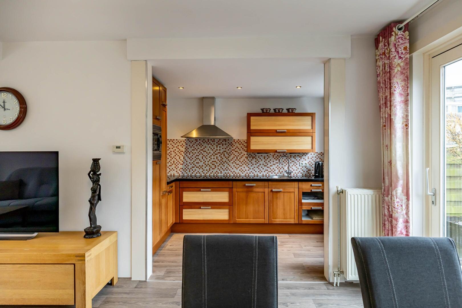 De woonkamer is een heerlijke lichte doorzonkamer met grote raampartrijen die heerlijk zicht bieden op de grote voortuin. De open keuken is heel toegankelijk en biedt veel ruimte en lichtinval.