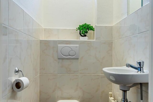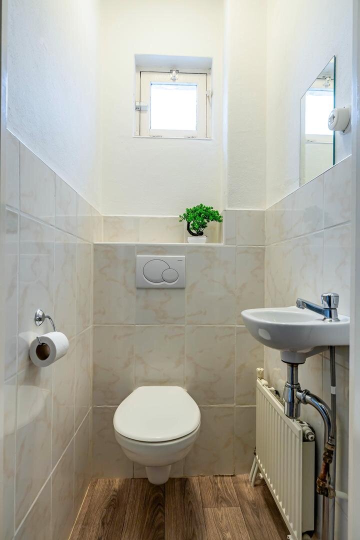Het toilet is netjes betegeld met een keurige afwerking en voorzien van een wandcloset en fonteintje.