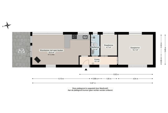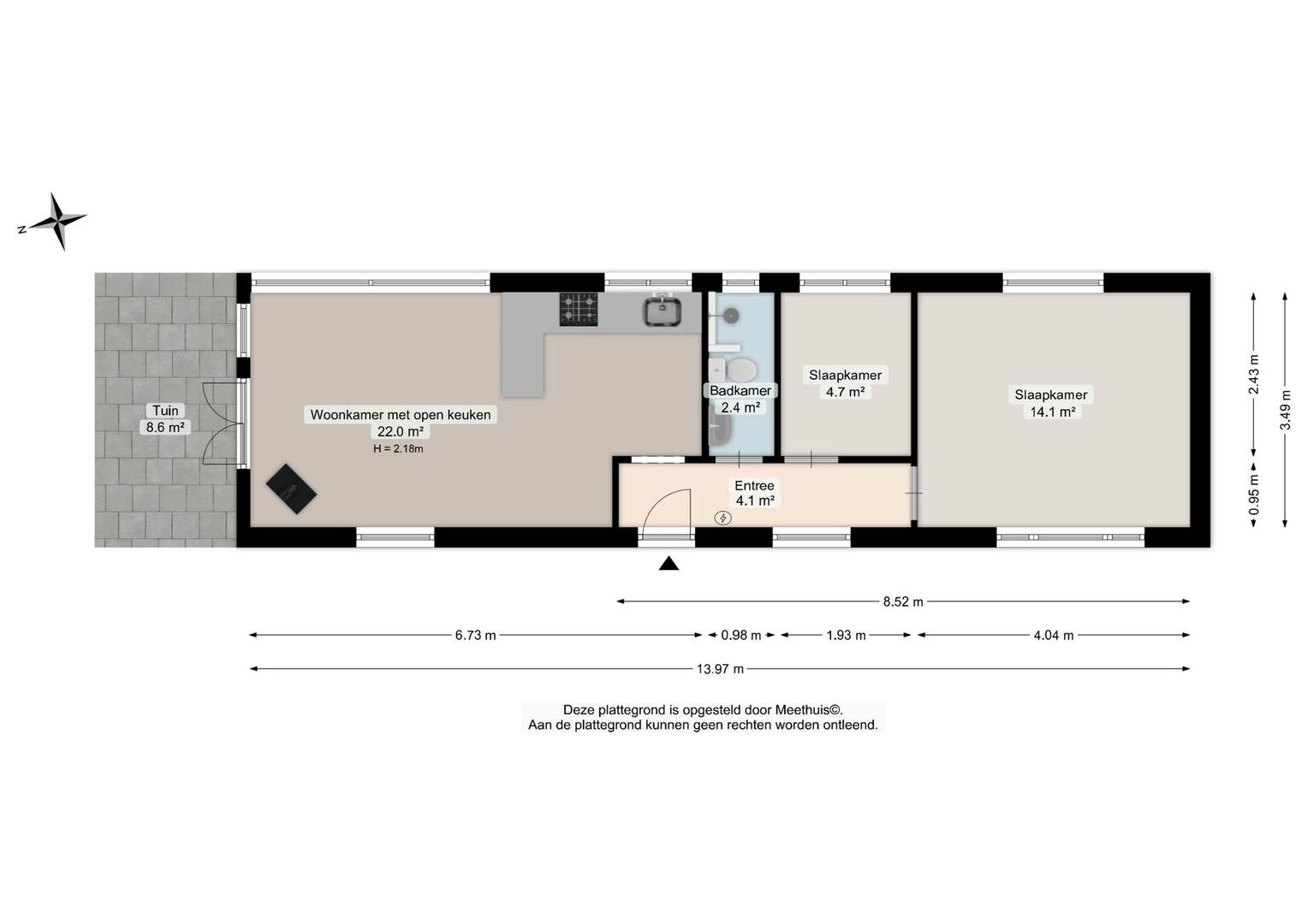 Entree/hal, knusse woonkamer met moderne open keuken en openslaande deuren naar een zonneterras direct aan het water, vanuit de entree is de badkamer te bereiken en voorzien van een douche, toilet en wastafel. Twee slaapkamers van respectievelijk ca. 5 m2 en 14 m2 groot. De keuken is voorzien van diverse inbouwapparatuur, zoals een 4-pits gasfornuis, afzuigkap, oven, koelkast, vaatwasser en veel kastruimte. Koken wordt gedaan op butaangas.