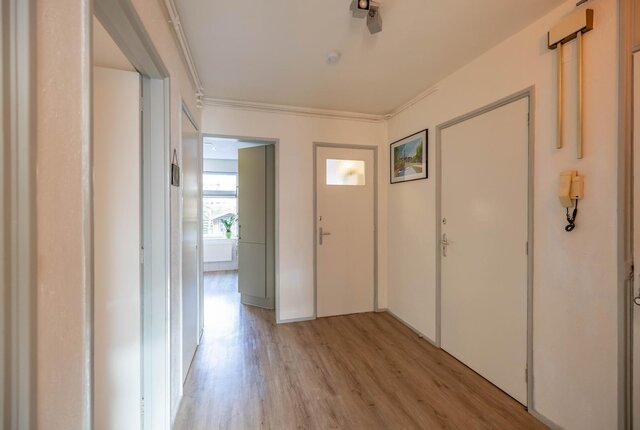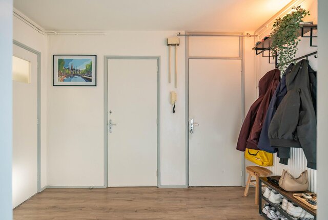 Begane grond: er is een afgesloten entree met intercom en brievenbussen. Je komt dan in een nette portiek met een trapje naar beneden naar de eigen en ruime inpandige berging. Of je neemt 5 treetjes naar boven en je vindt op de eerste woonlaag…