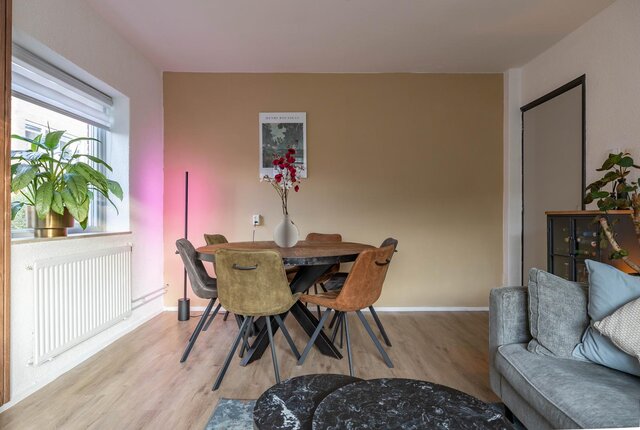 Door de unieke hoekligging is er een zijraam waardoor je geniet van veel lichtinval. Hier is ook plaats voor een gezellige eethoek, waar ook een grotere tafel makkelijk geplaatst kan worden.