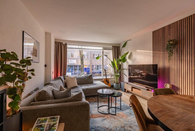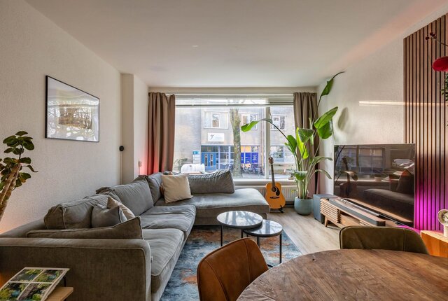 Vanuit de hal zijn alle vertrekken bereikbaar. De woonkamer is straatgericht en biedt genoeg plaats voor een heerlijke zithoek. Doordat de woonkamer op ongeveer 1,5 meter boven het straatniveau is, kijk je heel leuk de straat in, en ervaar je toch veel privacy.