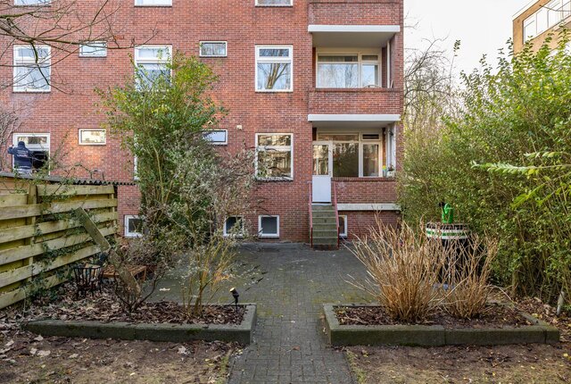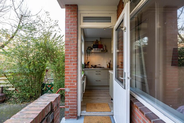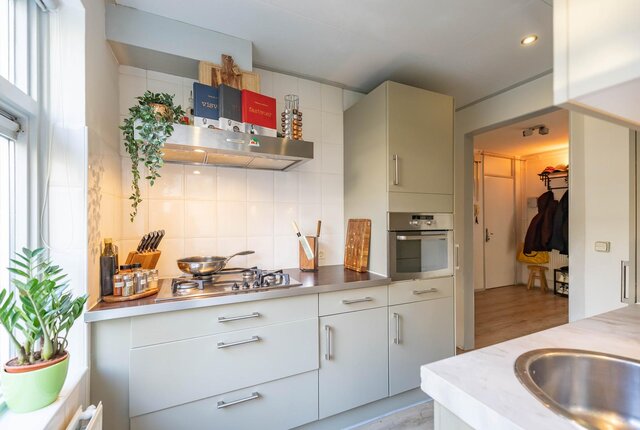 Er is een gesloten keuken met een keurig keukenblok, voorzien van vaatwasser, een kookplaat, afzuigkap, oven en een koel-vriescombinatie. In de zomer kook je hier lekker met de deur open en heb je contact met het balkon aan de achterzijde. Middels een klein trapje naar beneden kom je in een groene oase met fraaie bomen en een heerlijke besloten tuin. Je kunt hier naar hartenlust tuinieren of heerlijk relaxen.