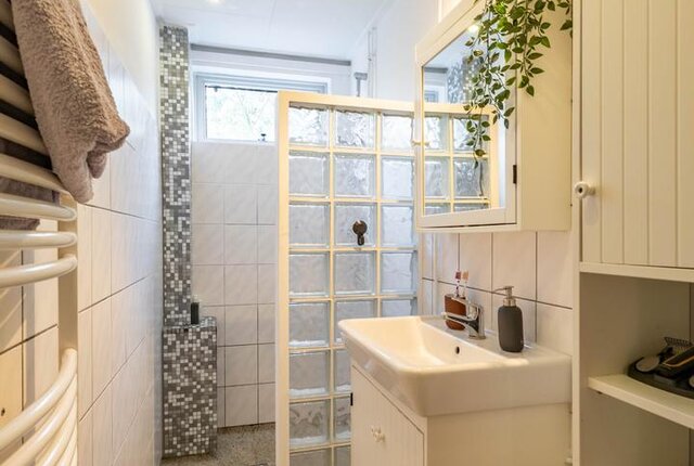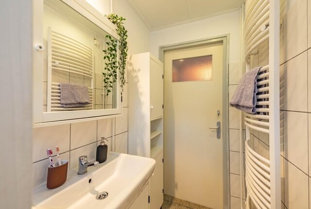 De badkamer is netjes, met een ruime douche, voorzien van speelse glas-elementen en een wastafelmeubel en designradiator. Het toilet is separaat gesitueerd.
