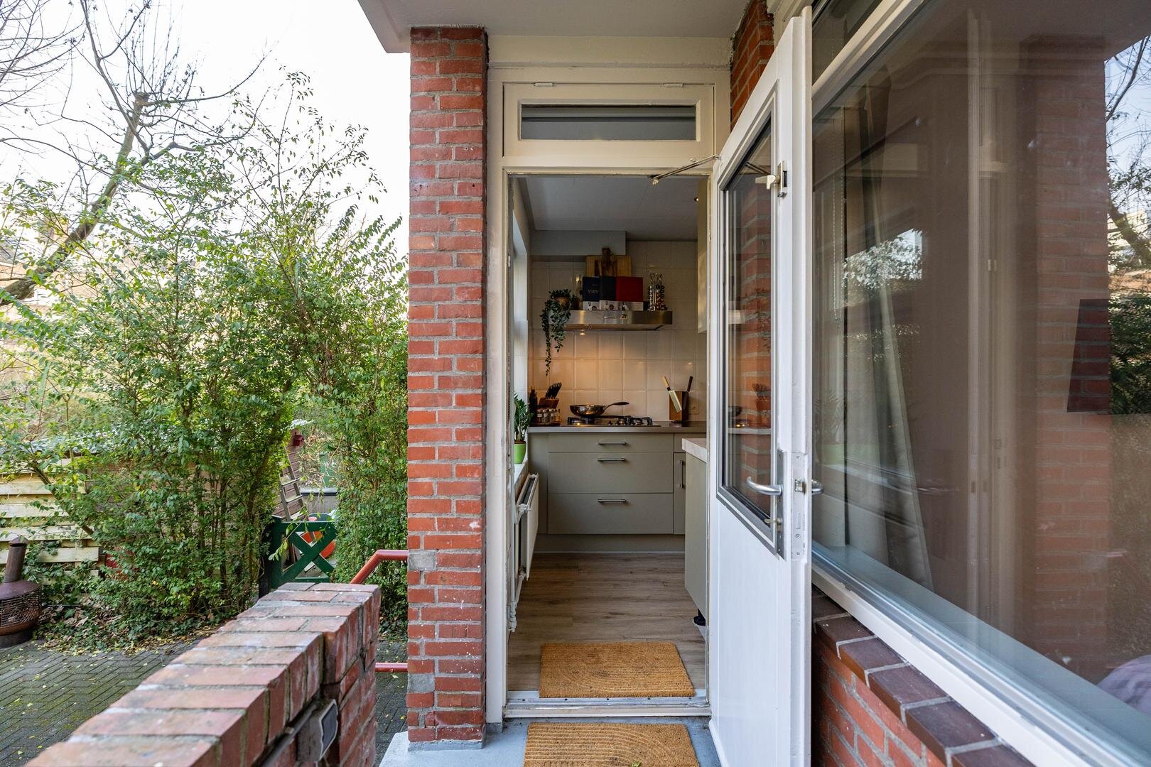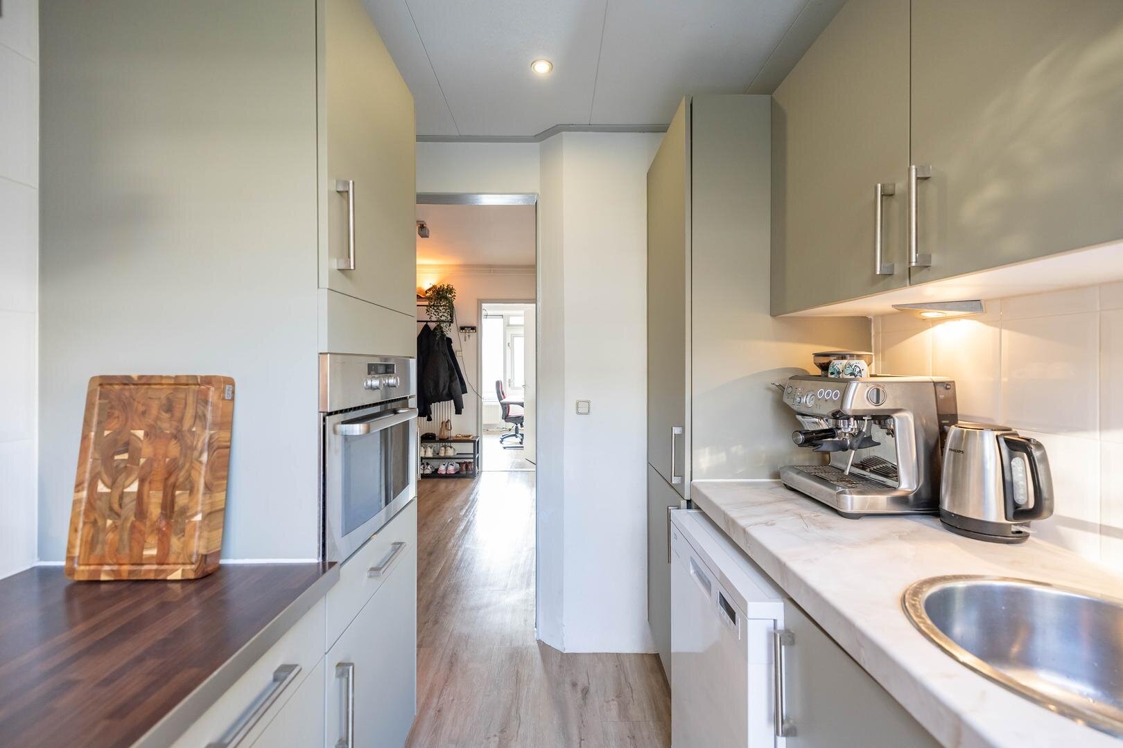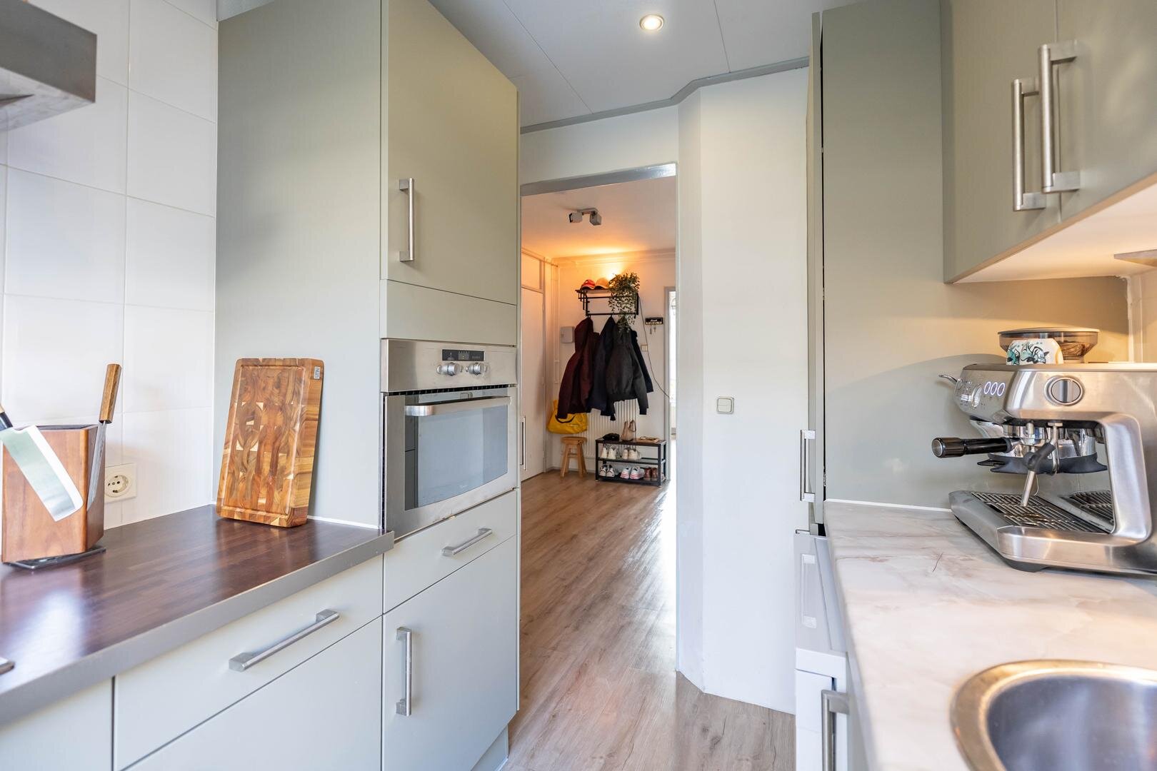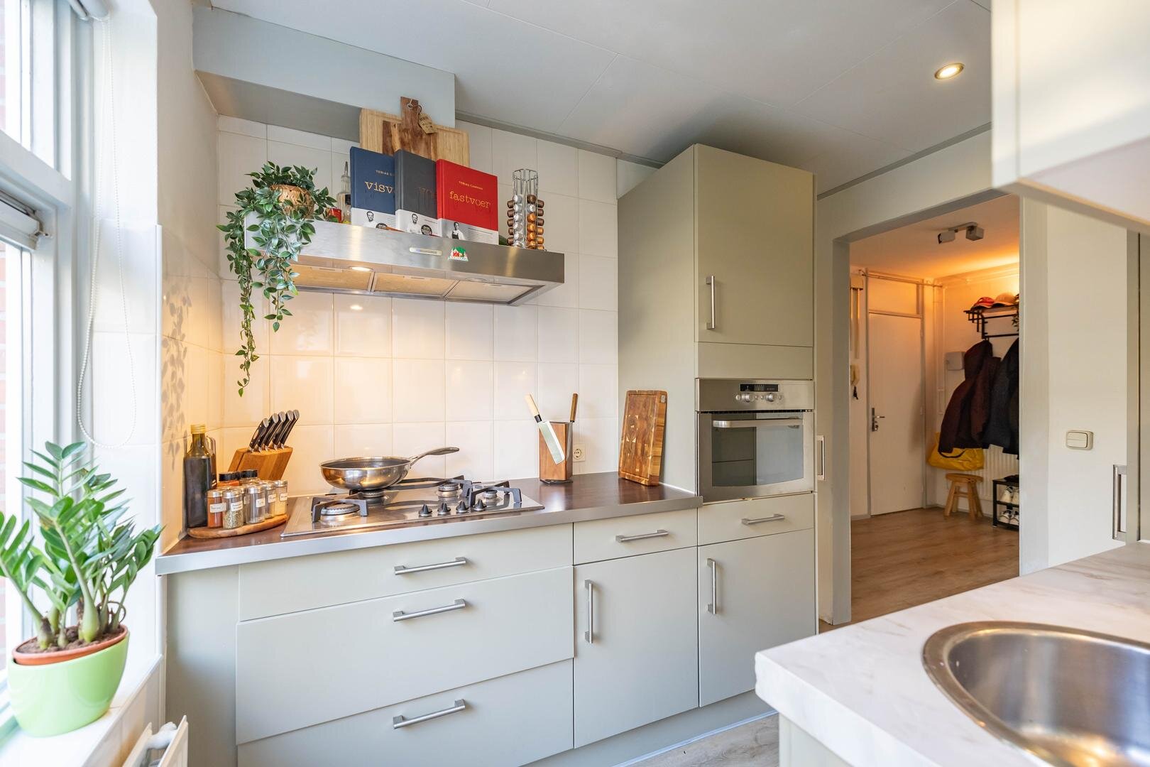 Er is een gesloten keuken met een keurig keukenblok, voorzien van vaatwasser, een kookplaat, afzuigkap, oven en een koel-vriescombinatie. In de zomer kook je hier lekker met de deur open en heb je contact met het balkon aan de achterzijde. Middels een klein trapje naar beneden kom je in een groene oase met fraaie bomen en een heerlijke besloten tuin. Je kunt hier naar hartenlust tuinieren of heerlijk relaxen.