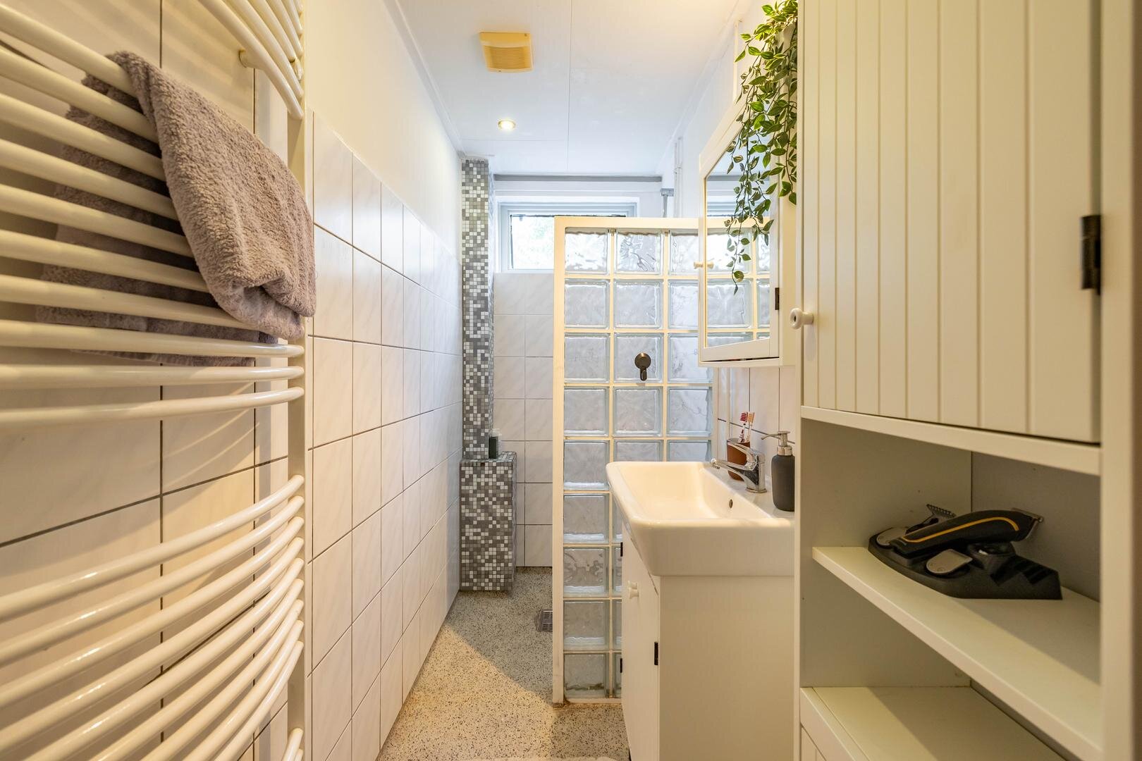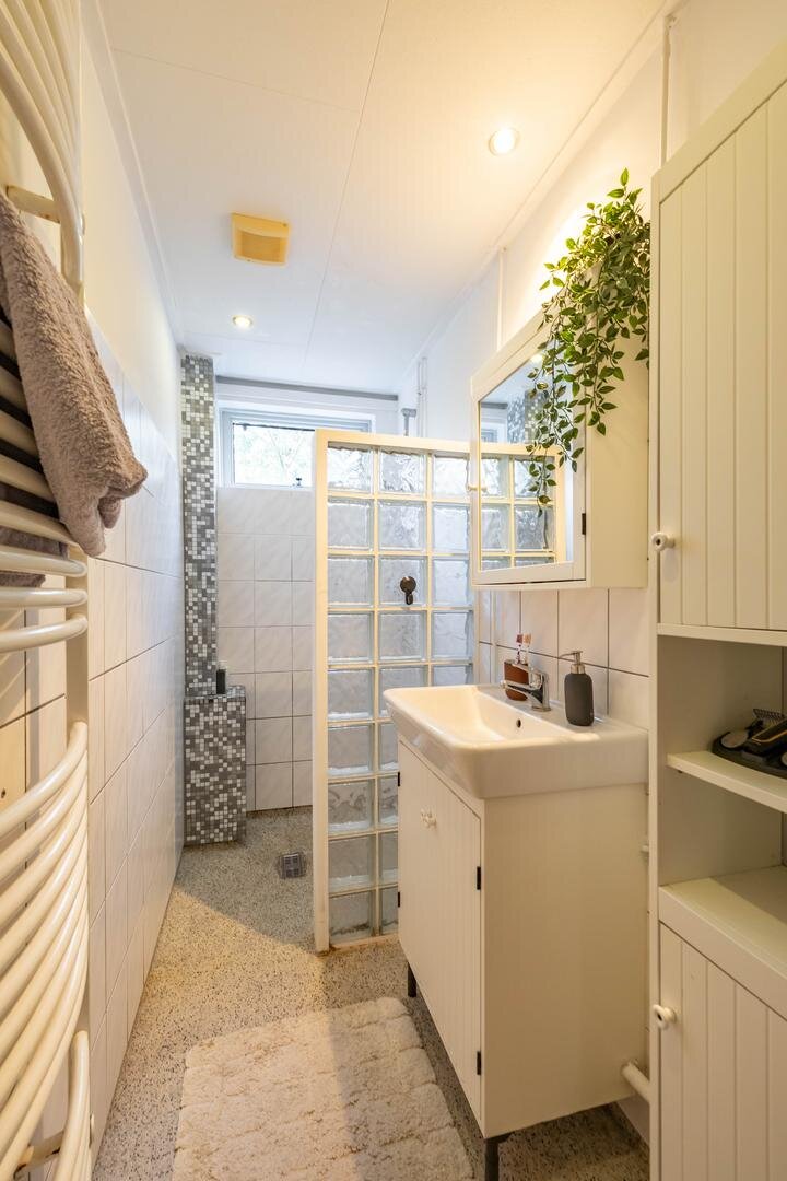 De badkamer is netjes, met een ruime douche, voorzien van speelse glas-elementen en een wastafelmeubel en designradiator. Het toilet is separaat gesitueerd.