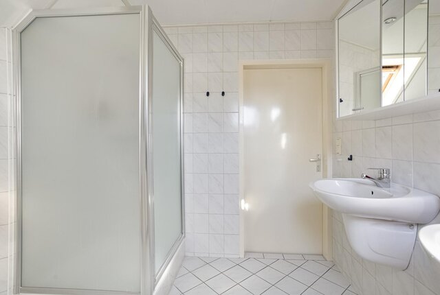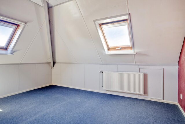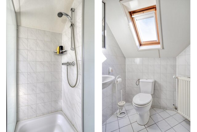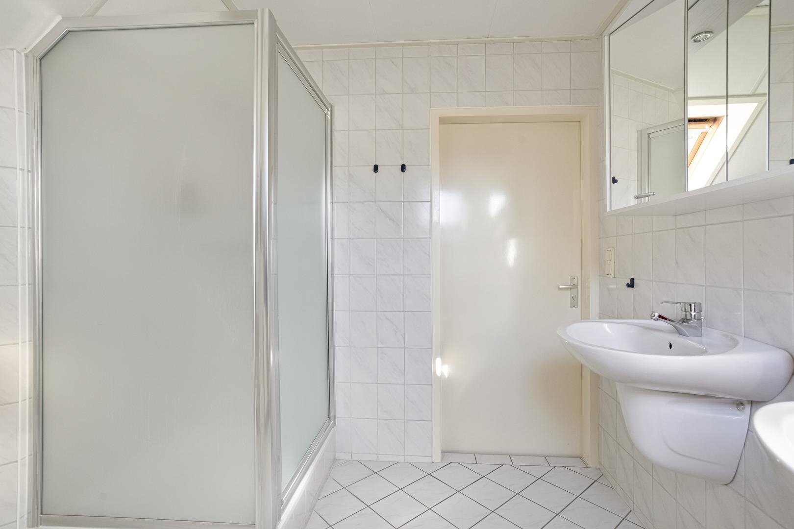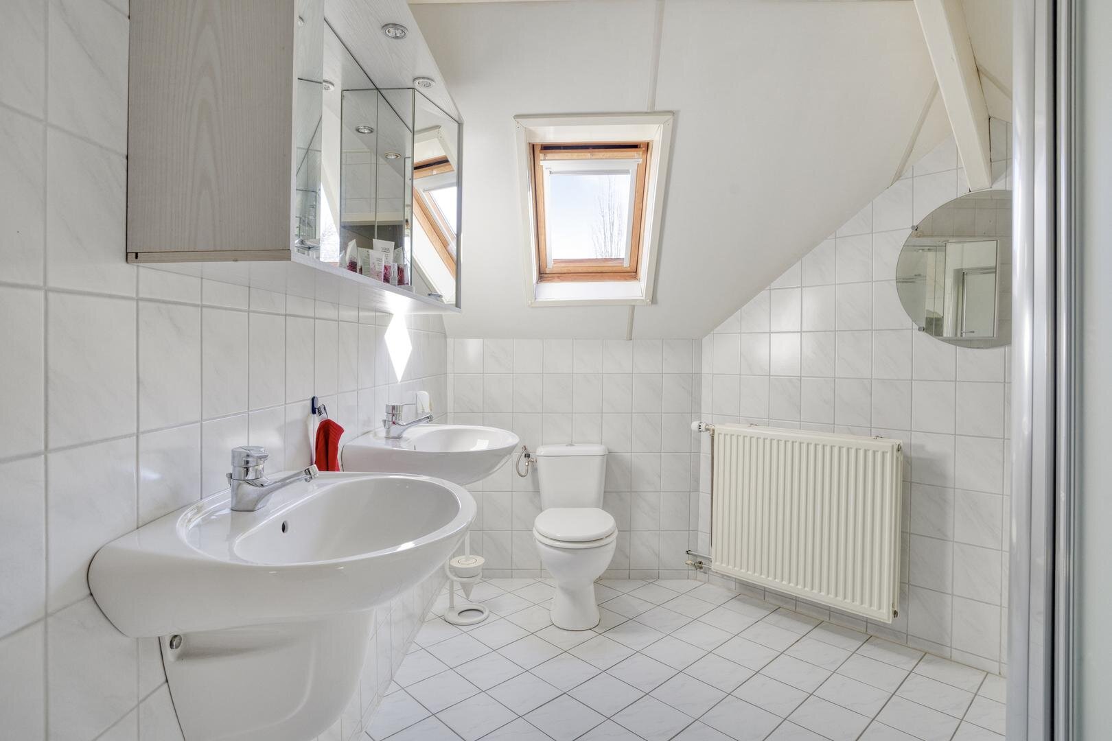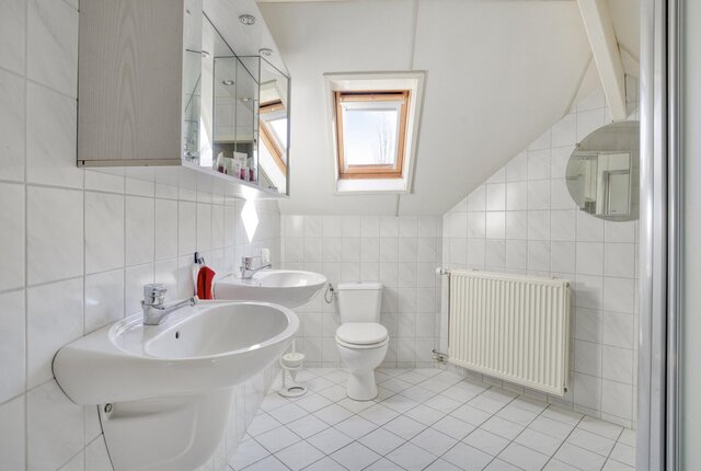 Overloop, 3 slaapkamers voorzien van dakramen en bergruimte achter de knieschotten. Tweede badkamer voorzien van een douchecabine, tweede toilet en dubbele wastafel.