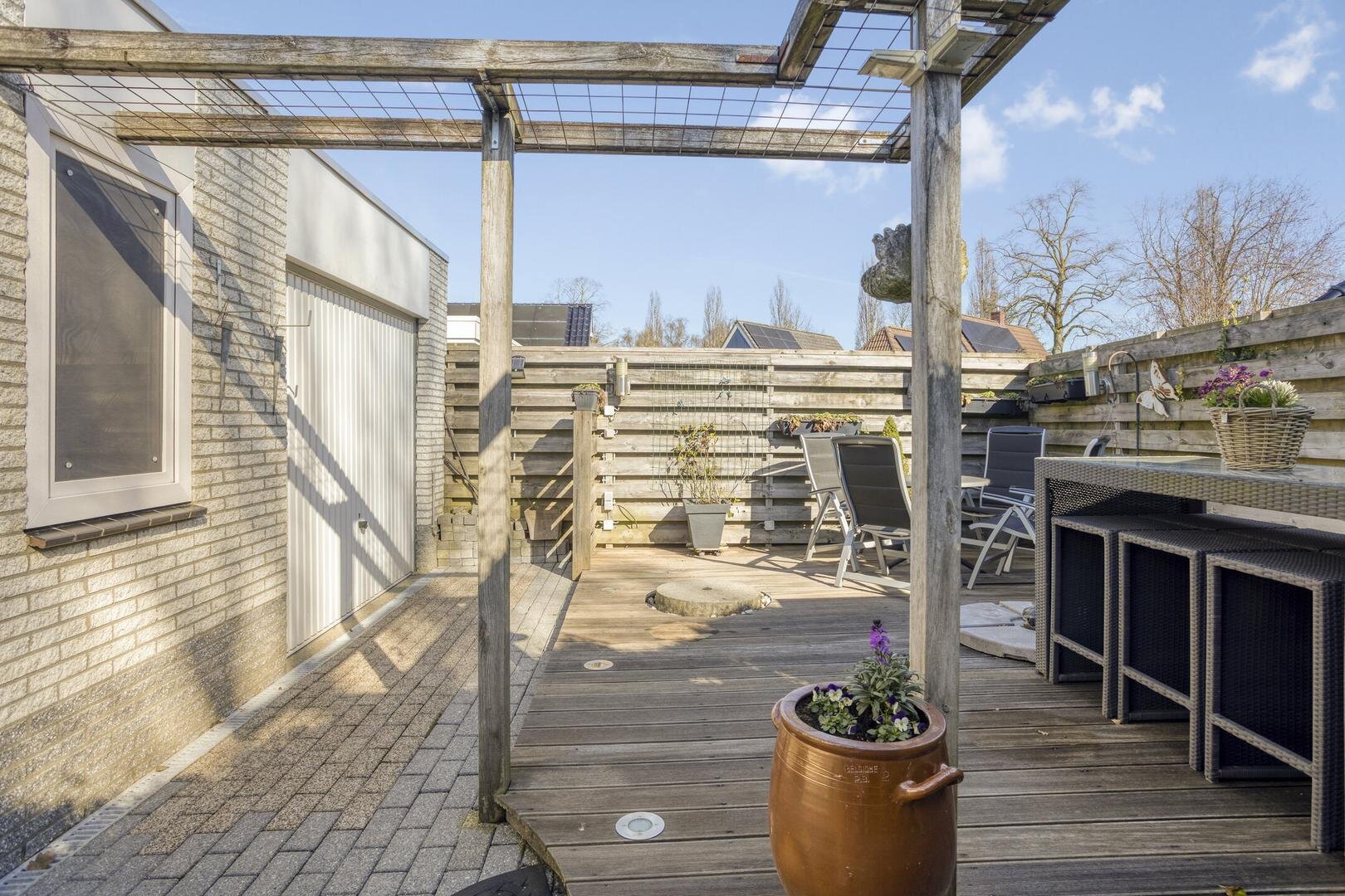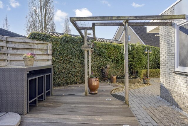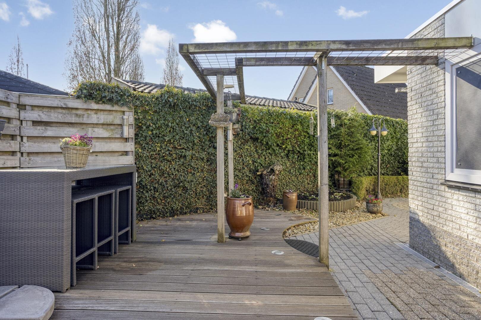 Het huis heeft verzorgde tuinen aan de voor-, zij- en achterkant, evenals een zonneterras. De grootste tuin bevindt zich aan de achterzijde en is gelegen op het zuidoosten. De tuinen worden goed onderhouden en zijn bereikbaar via een achterom.