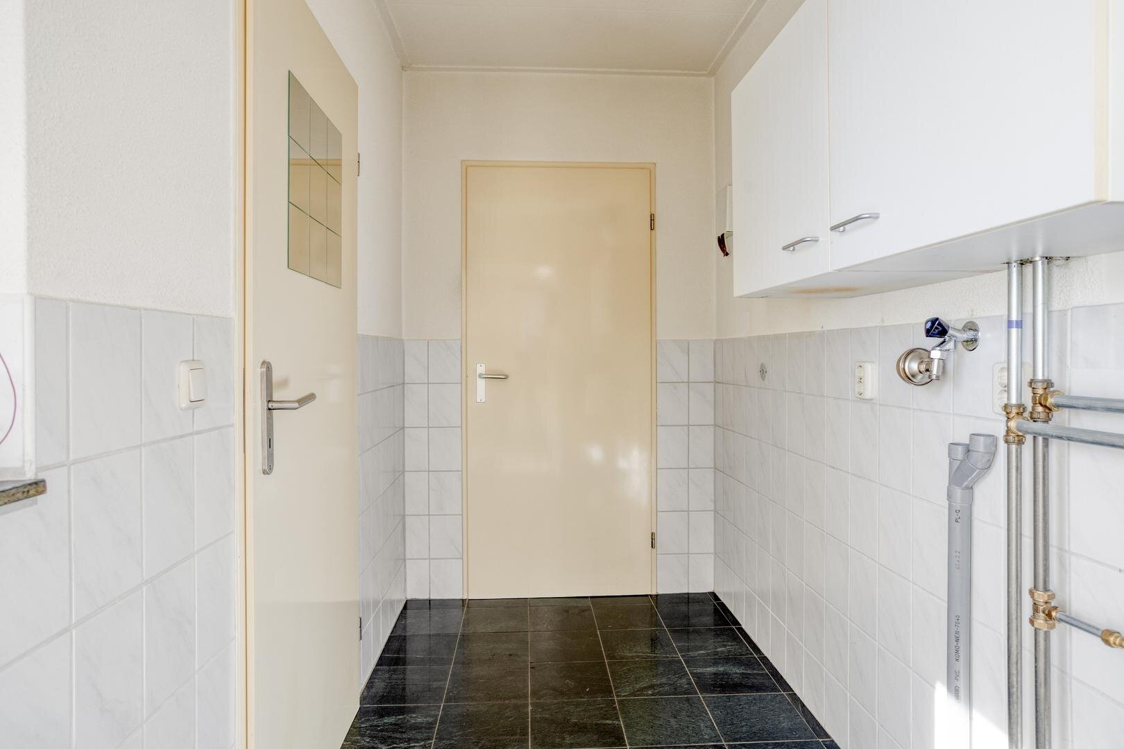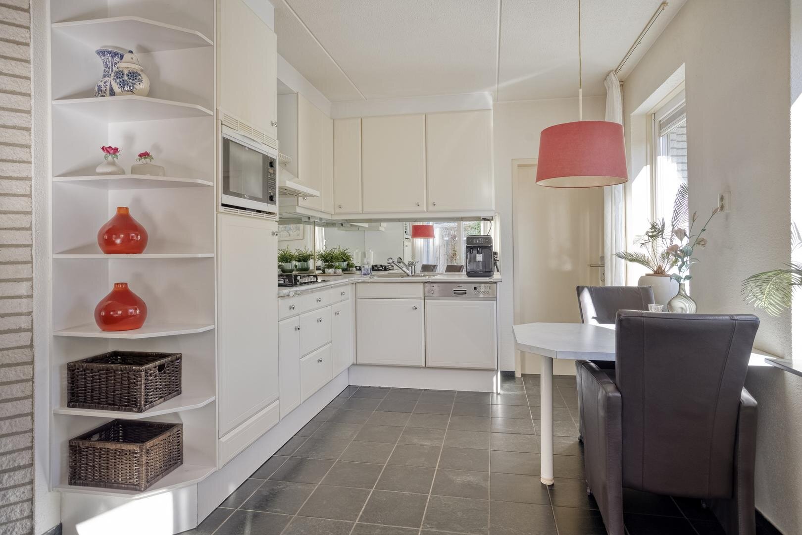Entree/hal met trapopgang, toilet met fonteintje, slaapkamer van circa 11 m2, badkamer met ligbad, inloopdouche, wastafelmeubel, handdoekradiator en mechanische ventilatie. Ruime woonkamer met veel lichtinval en voorzien van openslaande deuren naar de achtertuin, airco en vloerverwarming. Open keuken met een nette keukenopstelling en voorzien van diverse inbouwapparatuur, zoals: 5-pits gasfornuis, koelkast, magnetron, vaatwasser en afzuigkap. Vanuit de keuken toegang naar de bijkeuken met opstelling voor de witgoedaansluitingen en HR-combiketel plus deur naar een ruime bergkast. Vanuit de bijkeuken toegang naar de ruime garage van circa 36m2 met toegang naar de achtertuin en een elektrische garagedeur.