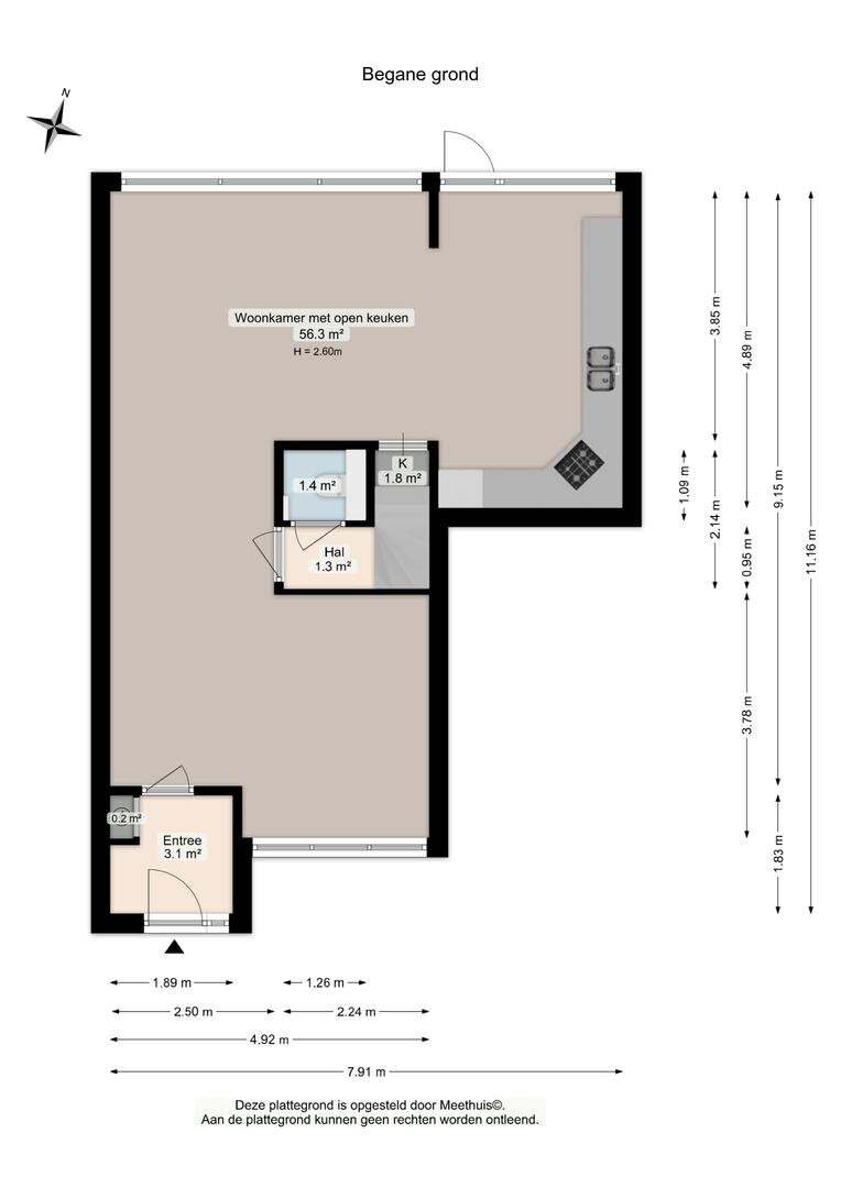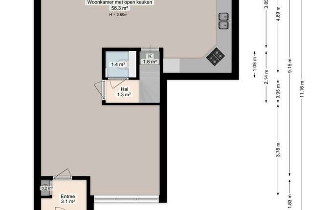 Eenmaal binnen wordt je begroet door een ruime woonkamer van 56m² met een L-vormige indeling, wat perfect is voor ontspanning en gezelligheid. De kamer heeft toegang tot de open keuken, ideaal voor degenen die het leuk vinden om te koken en tegelijkertijd gasten te entertainen.