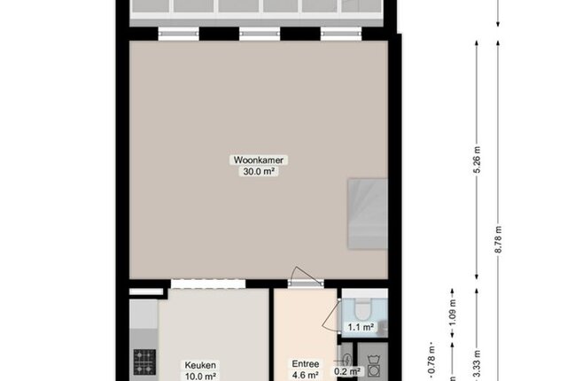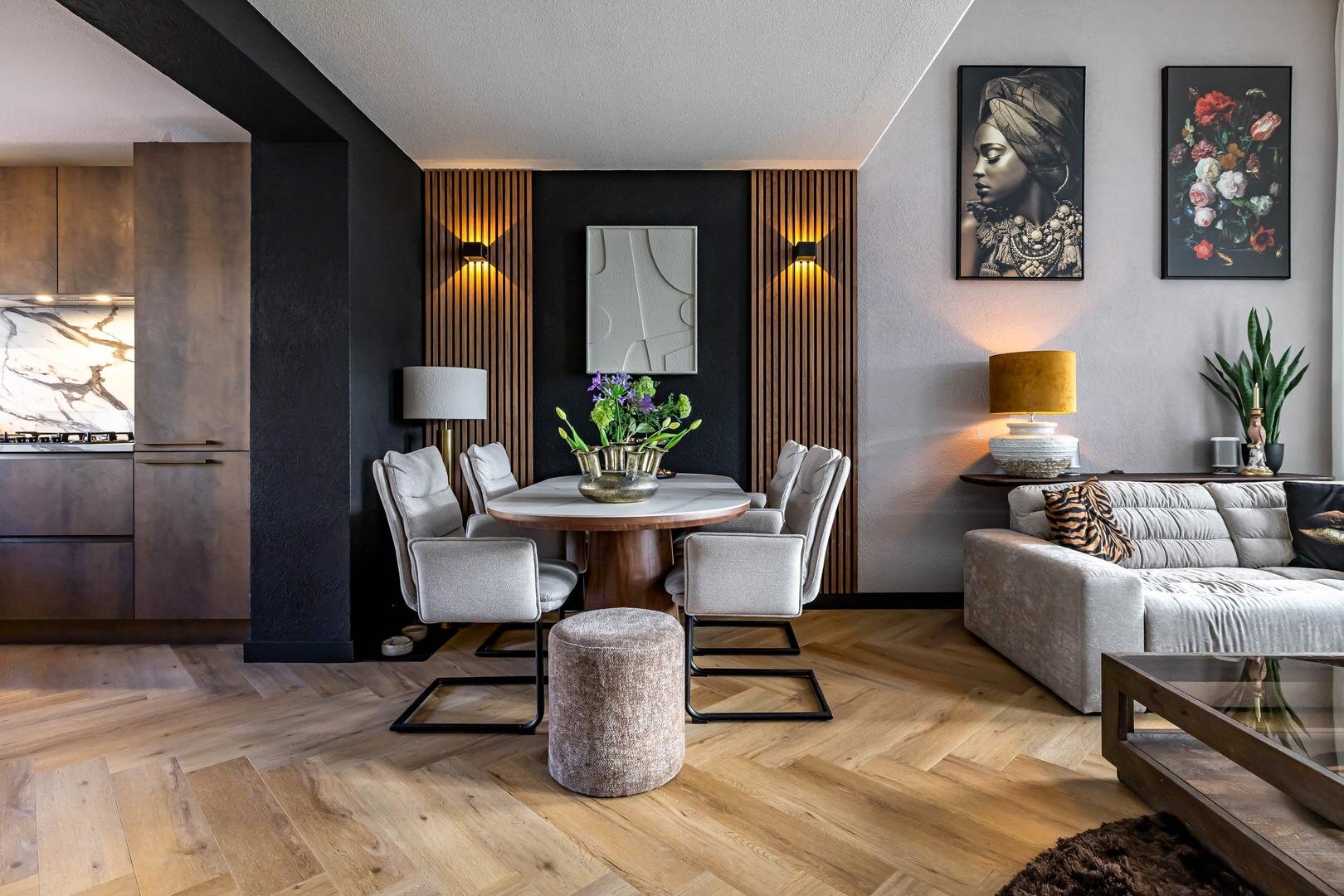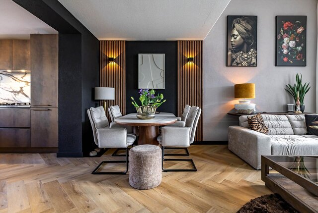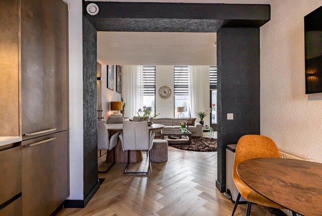 Wanneer je de woonkamer inloopt ervaar je meteen de heerlijke ruimte beleving door het verrassend hoge plafond van maar liefst 3,46 meter hoog. Daarmee heeft de woning ook extra hoge raampartijen. Hier geniet je van veel lichtinval en mooi zicht op de tuin. In de woonkamer is er een mooie zithoek en er is een ruime en gezellige eethoek. De visgraat gelegde pvc-vloer geeft natuurlijk een superleuke sfeer.
