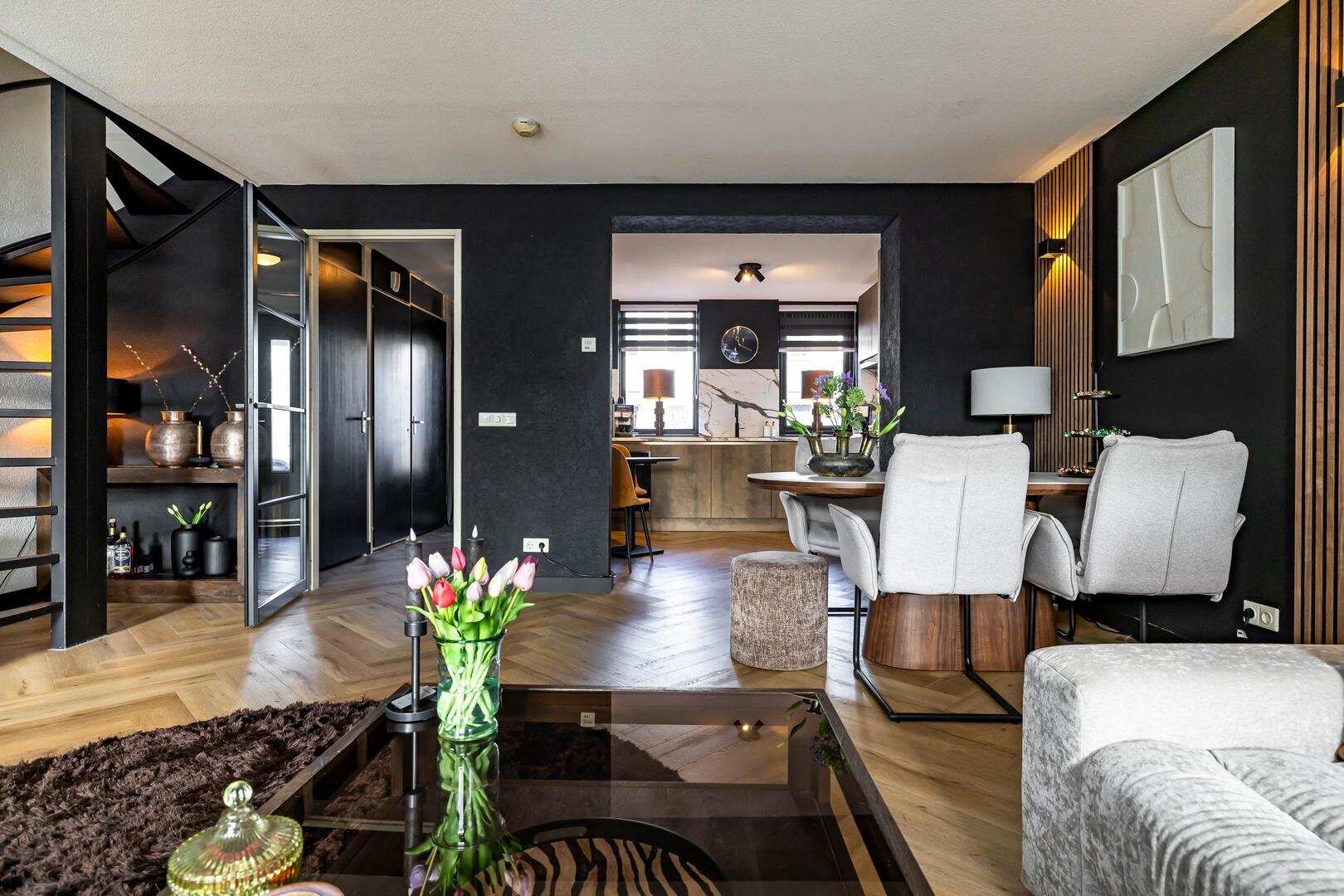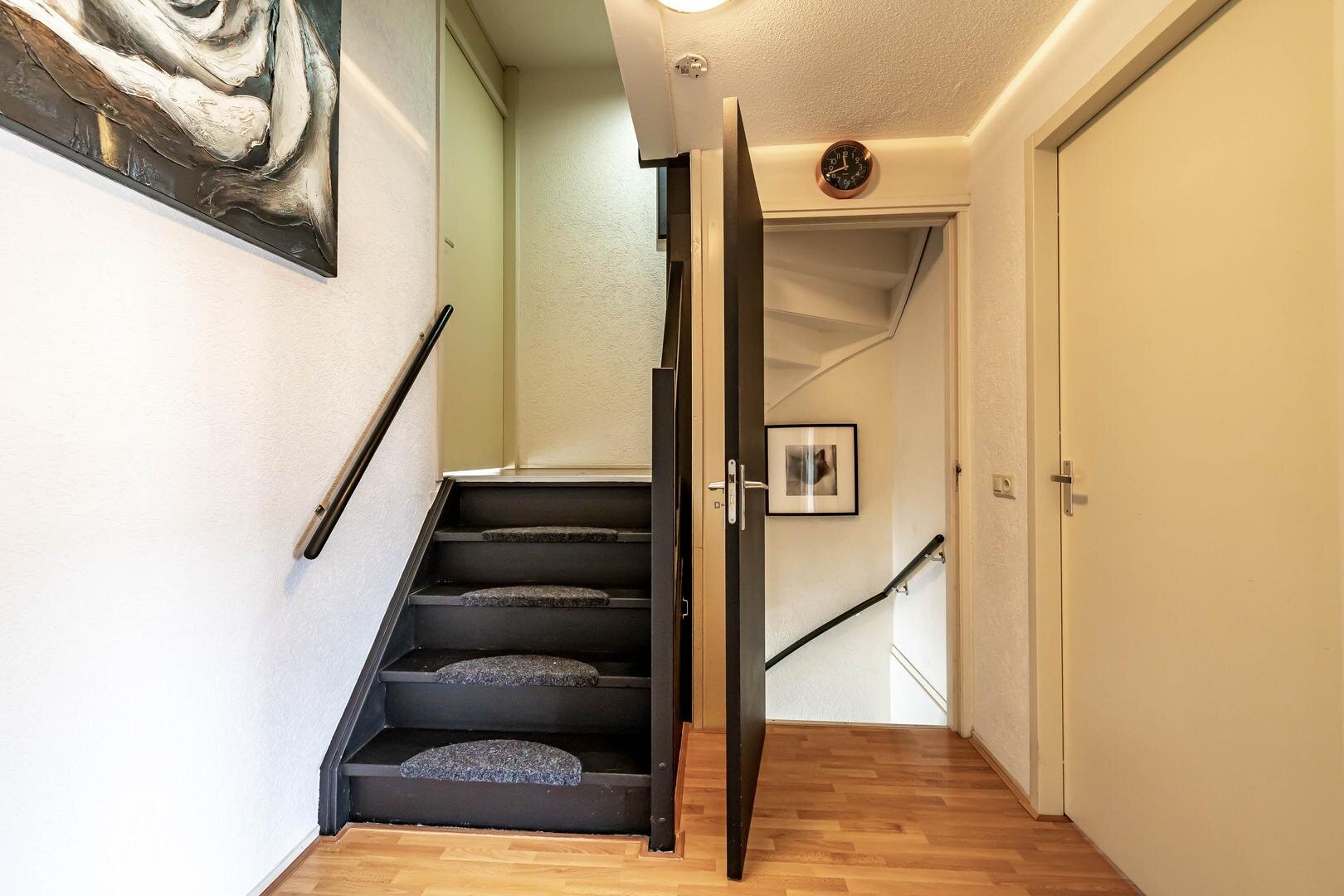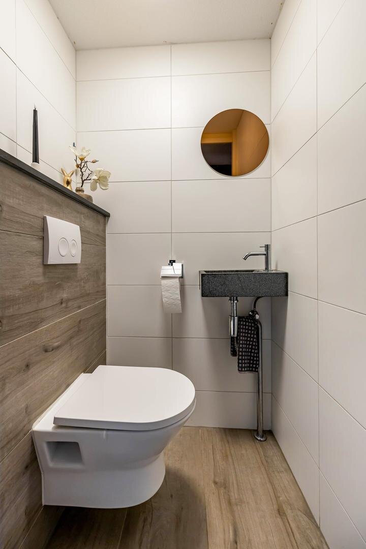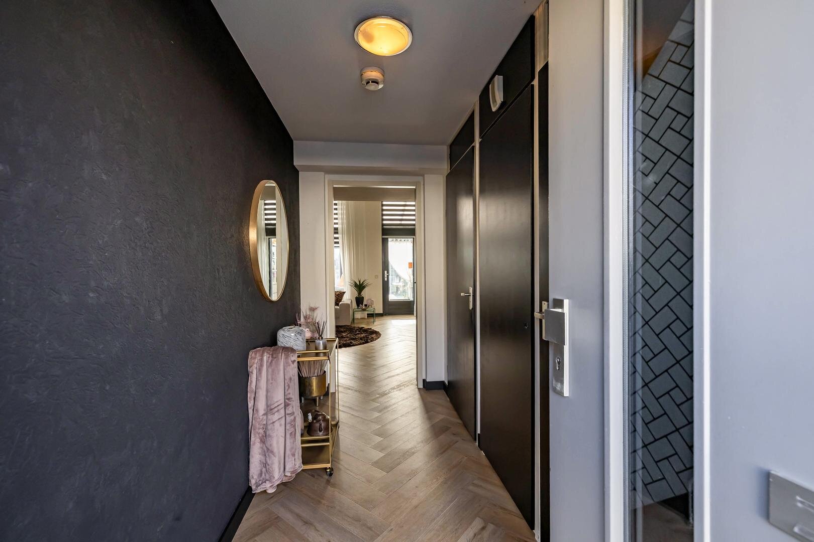 Kom binnen in de ruime hal met toegang tot de meterkast, toilet (voorzien van wandcloset en fonteintje) en er is een cv-/wasruimte met extra bergruimte. Vanuit de hal loop je door de fraaie stalen zwarte deur naar de woonkamer.