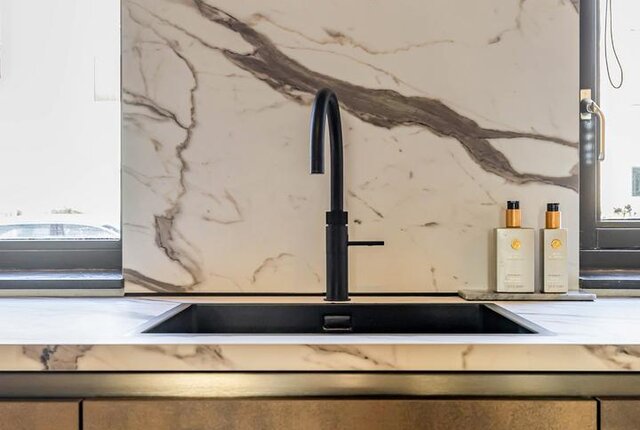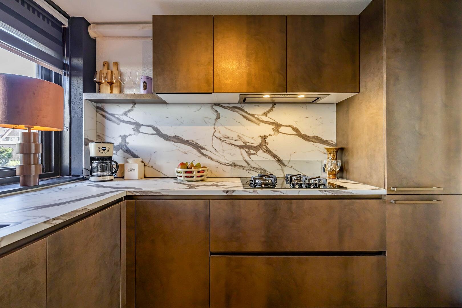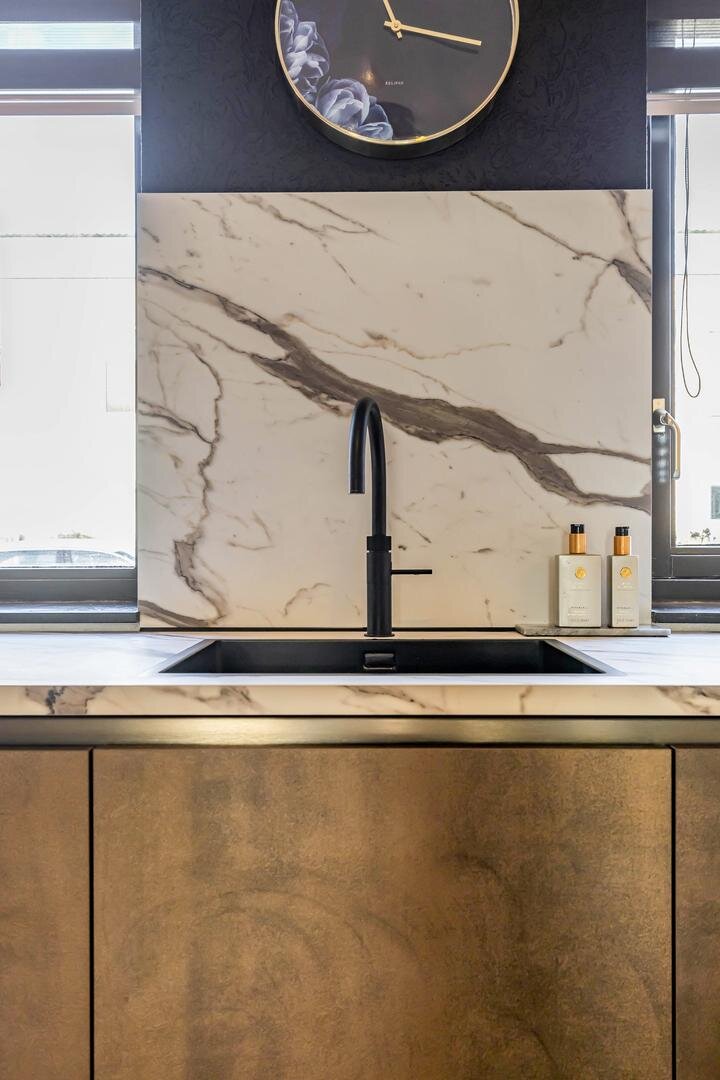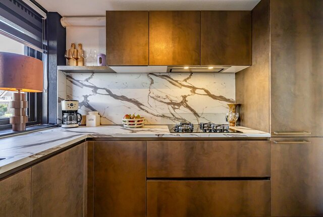 Via de doorloop kom je in de open keuken. De keuken en woonkamer meten samen maar liefst 40 m². De keuken is recent vernieuwd in 2025 en voorzien van een luxe in hoek opgesteld keukenblok met complete inbouwapparatuur, waaronder een 4 pits gaskookplaat, afzuigkap, Quooker, vaatwasser, combi-oven magnetron en een royale koel-vries combinatie.