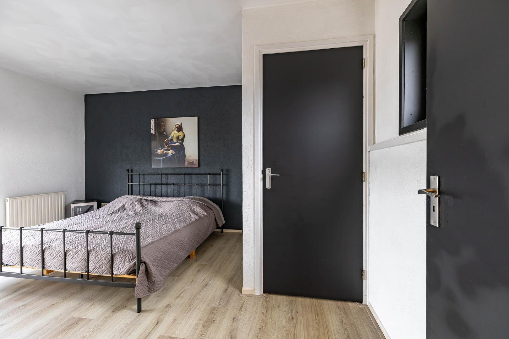 En dan komt de verrassing, want via een klein split-level trapje kom je in de grote master bedroom van ruim 17 m². Echt een heerlijke ruime slaapkamer met fraaie raampartijen en zicht op de achtertuin. Er is ruime plaats voor groot type tweepersoonsbed en een flinke kledingkast.